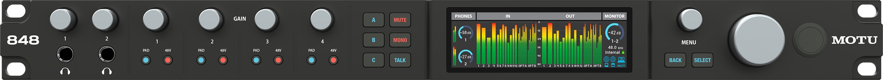 En el terreno de la conectividad AVB, la 848 incorpora un switch AVB integrado con dos puertos Ethernet, lo que da la opción de crear redes de audio con múltiples interfaces, ordenadores y dispositivos compatibles. Cada unidad puede transmitir y recibir 128 canales de audio a través de la red, con una latencia fija de solo 2 ms, incluso en instalaciones con cableados largos o configuraciones complejas. La interfaz es compatible con todos los modelos AVB anteriores de MOTU.