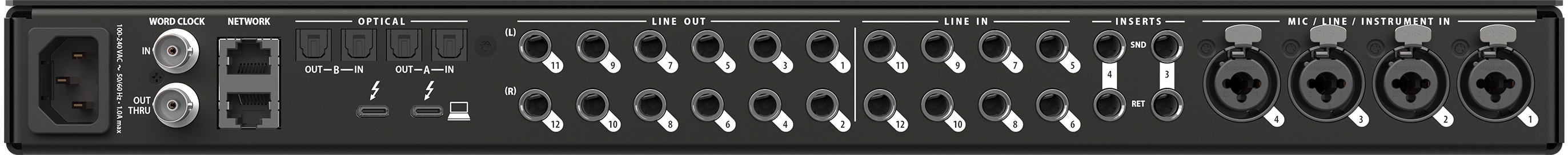 La MOTU 848 destaca por su conectividad híbrida, compatible con Thunderbolt 4, USB4, USB3 y USB2, lo que le permite trabajar con sistemas Mac, PC e incluso dispositivos iOS. Incluye un cable USB-C de 40 Gbps, y ofrece hasta 256 canales (128 de entrada y 128 de salida) a 96 kHz al trabajar con ordenadores. Además, se pueden encadenar hasta seis dispositivos Thunderbolt en una misma conexión, lo que facilita la expansión sin sacrificar ancho de banda.
