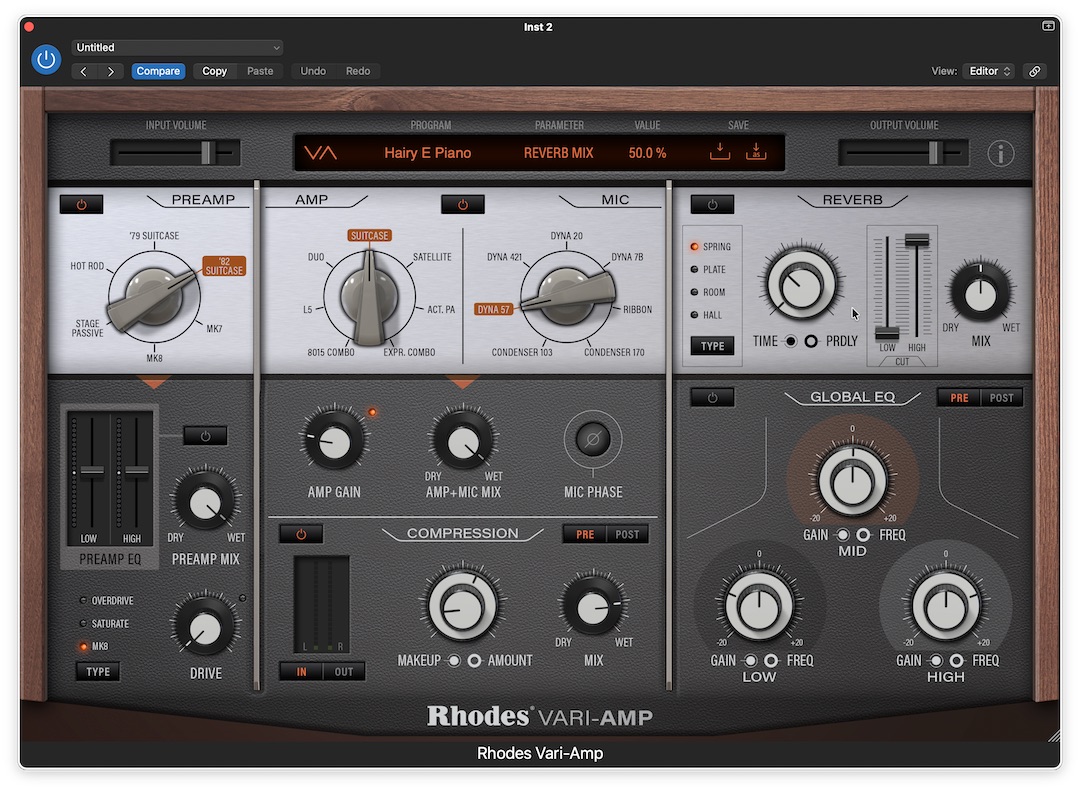 Además, Vari-Amp incorpora un compresor sencillo pero muy versátil, con opciones de mezcla paralela y enrutamiento pre/post, así como un ecualizador global y un módulo de reverb con cuatro algoritmos para completar la cadena. Y al sumarlo todo, tenemos una cadena de procesamiento muy vintage y muy Rhodes.