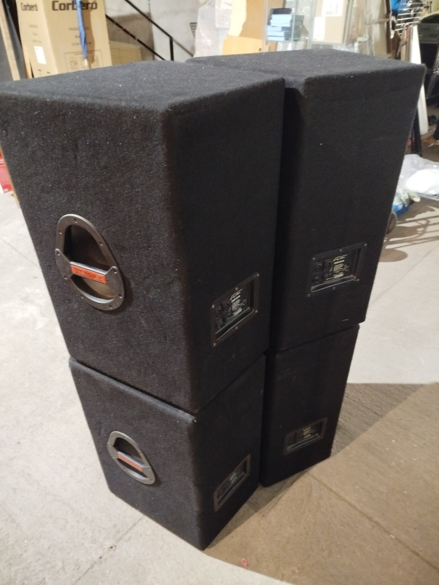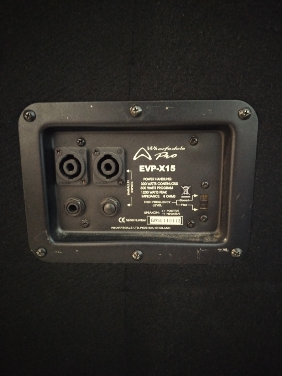 Equipo compuesto por cuatro cajas acústicas Wharfedale EVP 15 pasivas. Fabricadas en madera. En buen estado con los lógicos roces del uso. Sonido muy cristalino y con buena presión. 600 watts de programa cada una (300 watts RMS). Actualmente están en activo y funcionando perfectamente. Se vende el lote completo.
