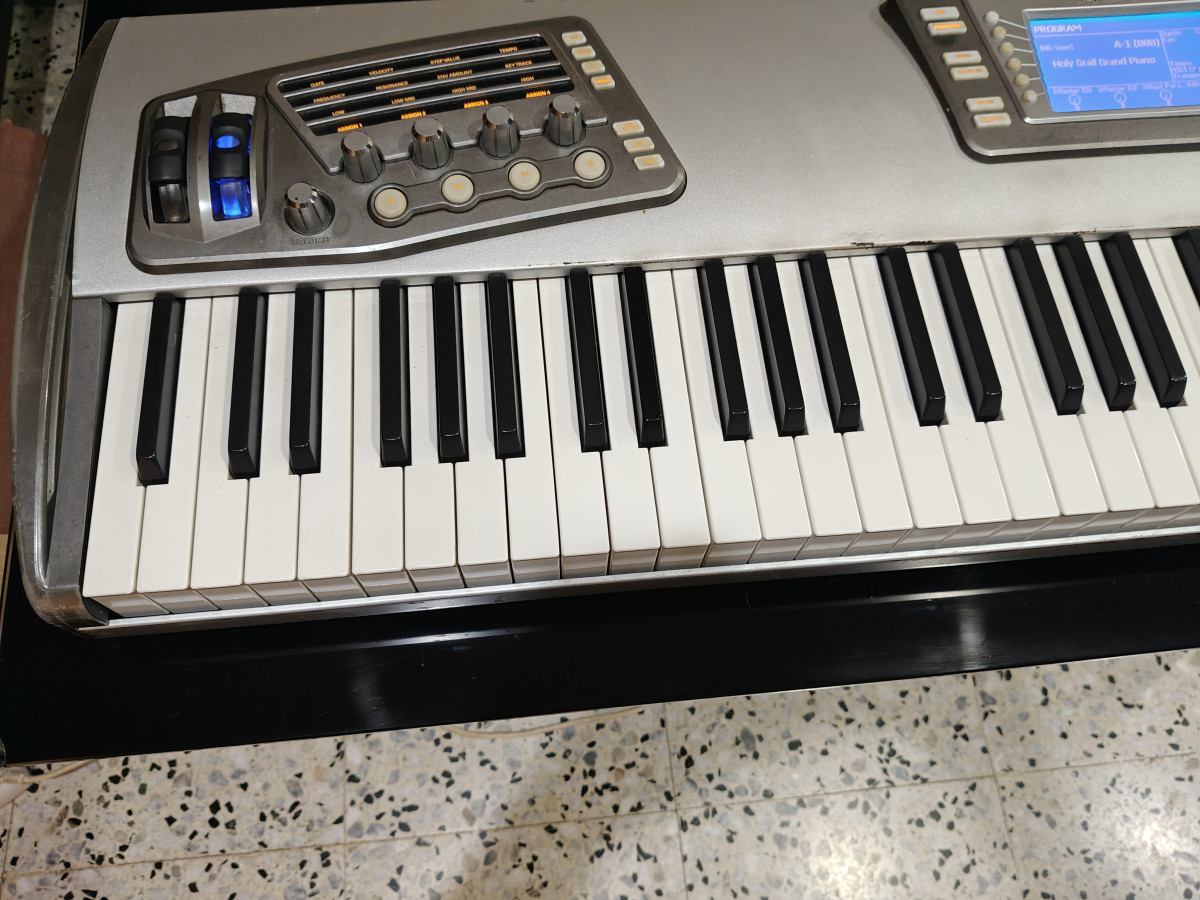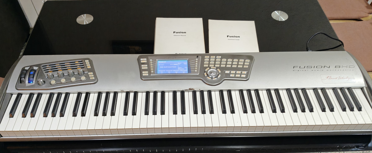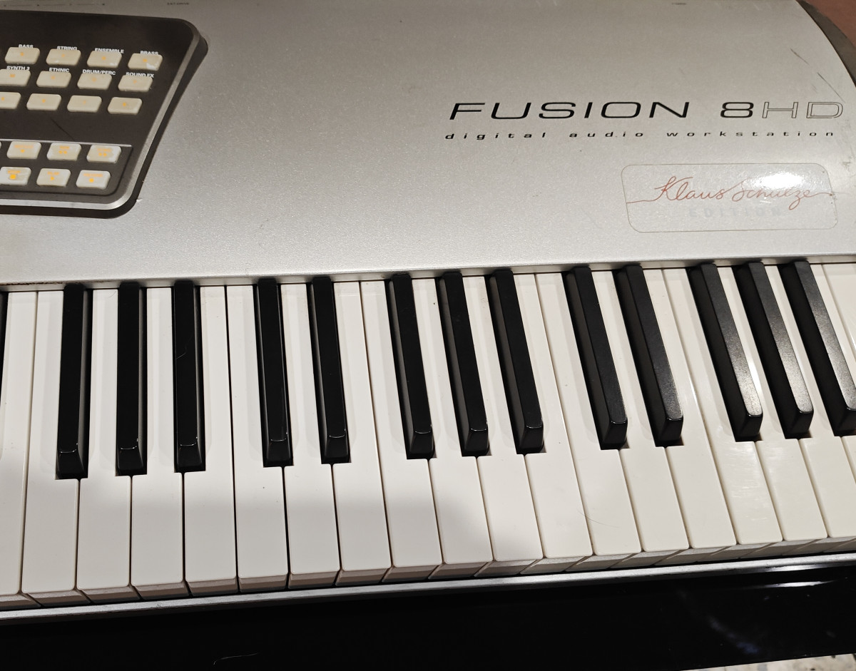 Teclado digital Alesis Fusion 8HD, edición especial Klaus Schulze. Incluye manuales. El teclado tiene muchos bolos y evidentes signos estéticos pero es completamente funcional y ha sido hasta hoy junto a mi yamaha mox 6 mi equipo para directos. Gomas teclas recien cambiadas y tambien ruedas de modulacion y pitch bend nuevos. Incluye manuales.El botón de on off está en posición fija en on, es decir al enchufar el cable se enciende el teclado ya que empezaba a fallar y se hizo un puente en los cables para dejarlo fijo. El precio NO incluye Flightcase, si lo quieres con él se añadiría 50 Euros al precio publicado. Portes a cargo del comprador. El teclado con el FlightCase mide 142x17x42 y pesa 41,7 Kg. Sin el FlightCase más embalaje no llegará a 30