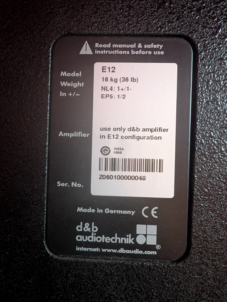 Par de altavoces D&B Audiotechnik E12 en color negro, en muy buen estado. Se incluyen dos altavoces y un amplificador D6. S.e incluye cableado NL4.