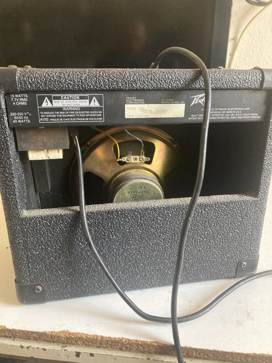Amplificador básico para principiantes. Suena bien. No tiene reverb.. Falta el asa de arriba para transporte pero que no afecta en nada al funcionamiento. 40 € envió aparte. Se puede probar si vienes a casa.