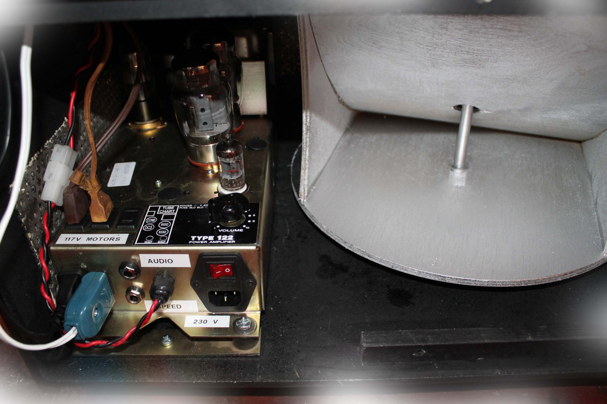 9- Amplificador de válvulas modelo 122, 230V. y motores de 117V. como todos los fabricados para el mercado europeo en los 60 y 70¨s., fabricado con el mismo esquema que la época pero con materiales actuales, muy superiores a los utilizados entonces. Los transformadores, en especial el de salida, fundamental para la consecución del timbre original, se fabrican exactamente igual, y con las mismas especificaciones, que en esos años..