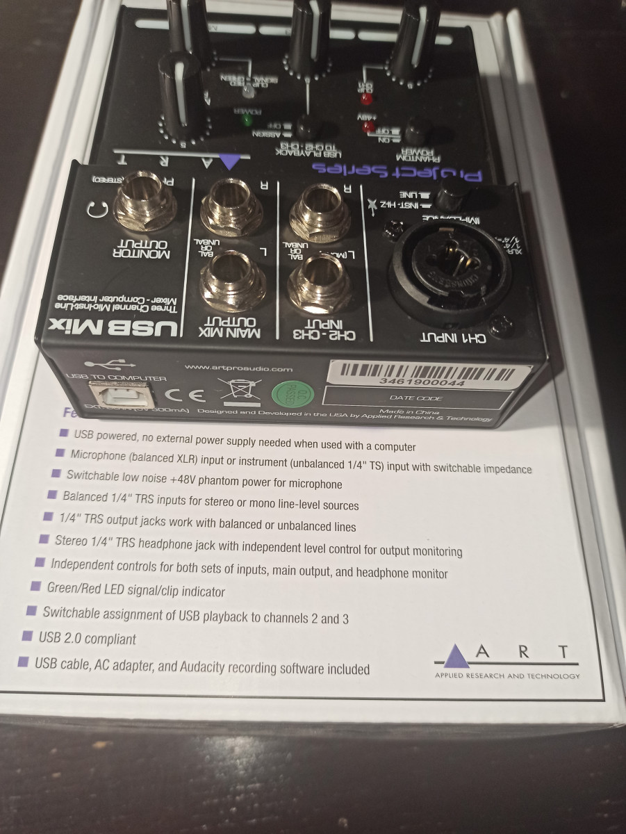 Entradas: XLR Mic simétrica, entrada de instrumento jack de 6.3mm, entrada de línea estéreo jack de 6.3mm (usable también en mono)