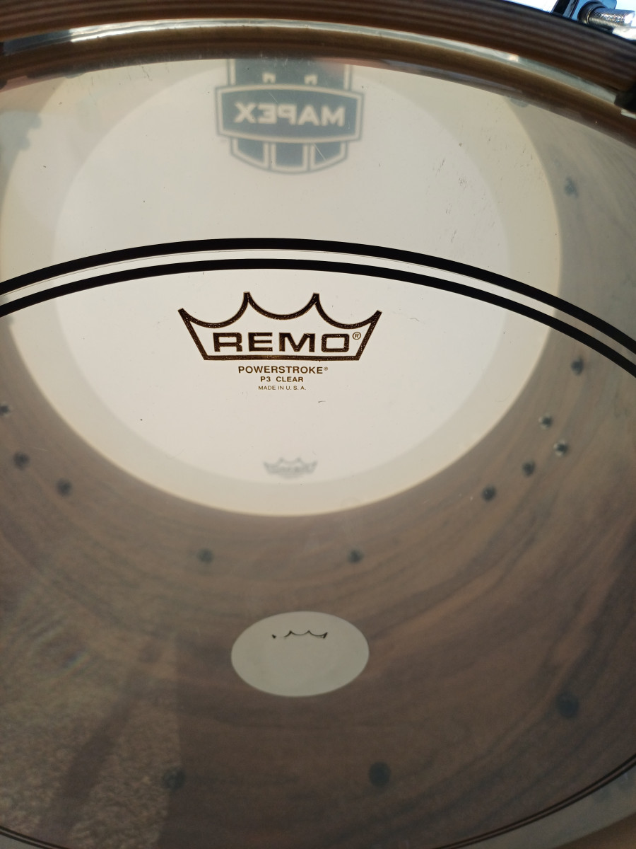 Parches Remo Emperor Clear en toms y P3 Clear en bombo. Se entrega con parche frontal original P4 Coated con logo Mapex.