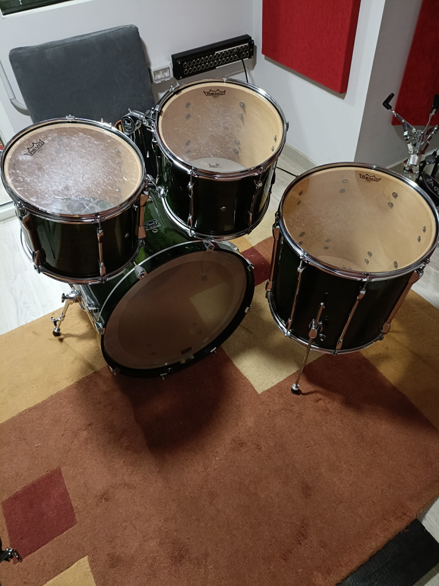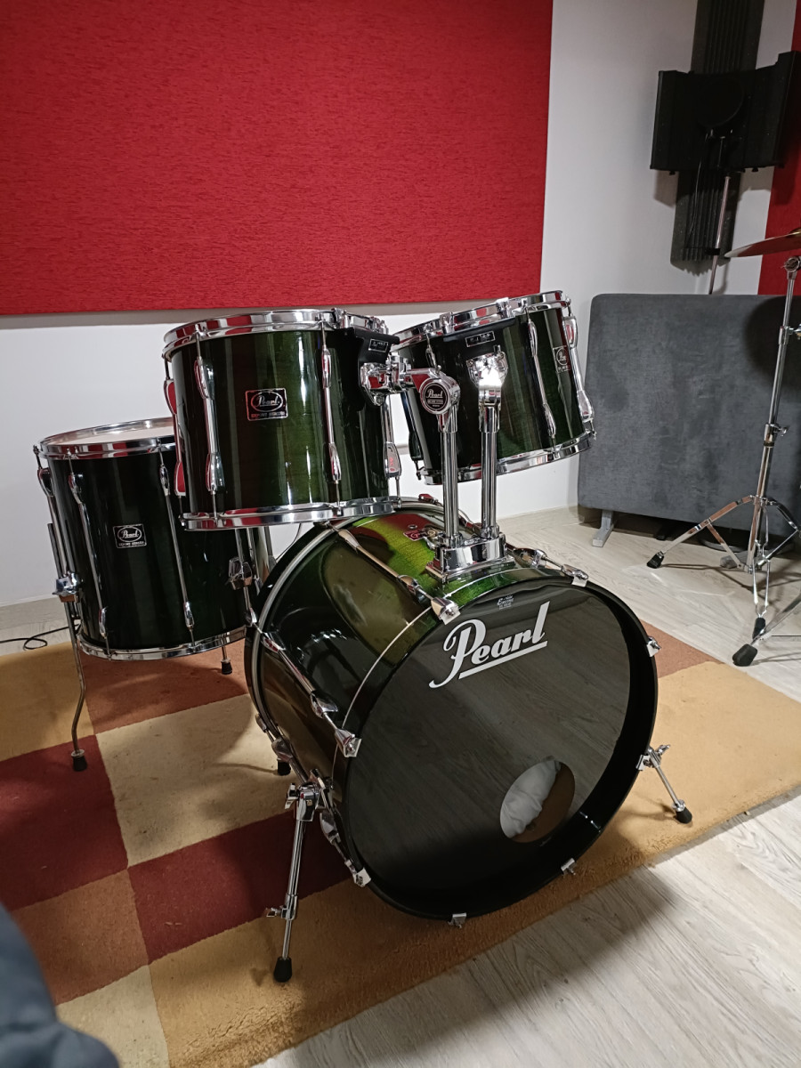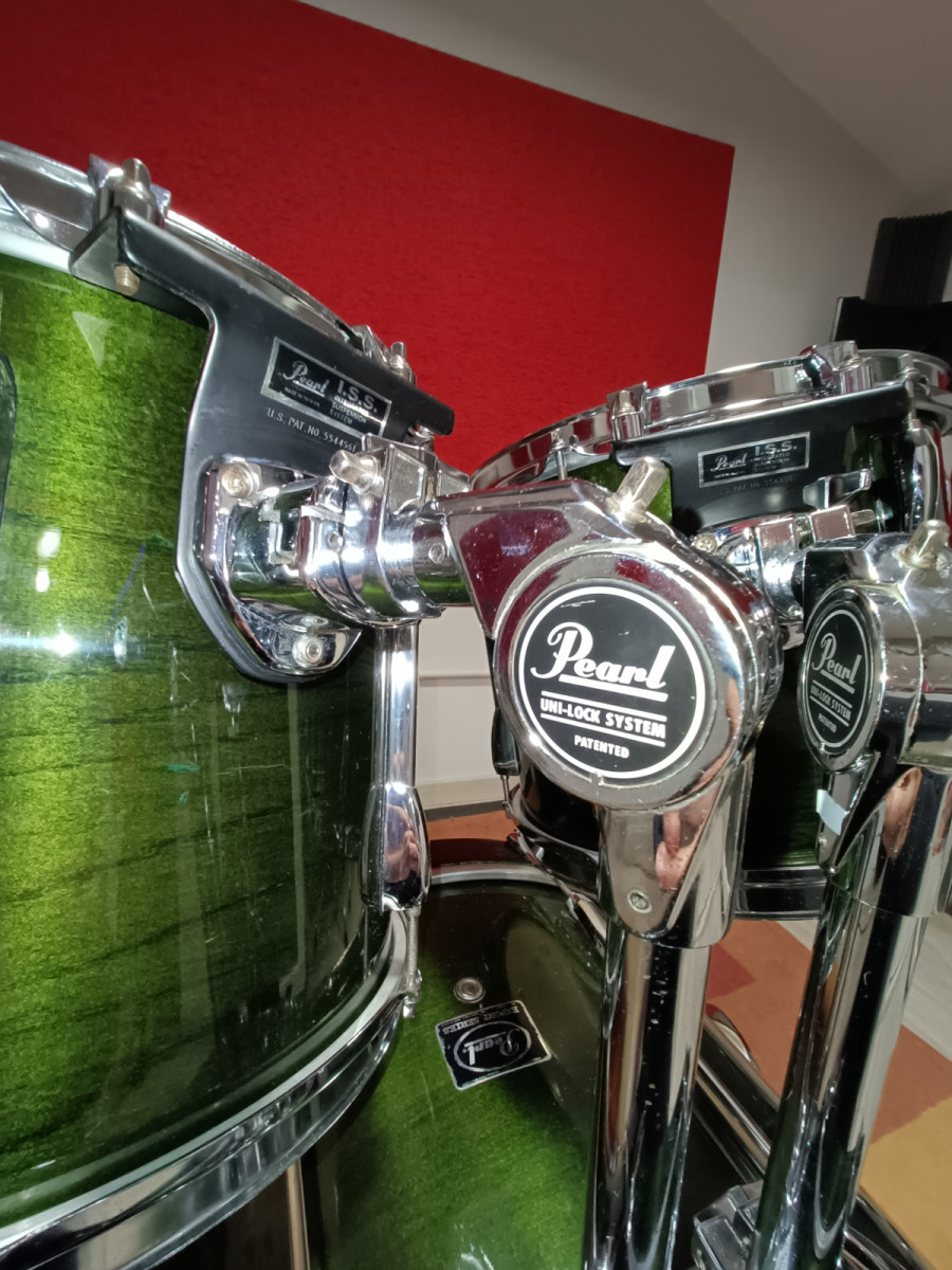 Batería Pearl Export de los años 90, medidas bombo 22, tom de 12 y 13 y base de 16" parches REMO, lacada en verde, con sistema de suspensión ISS de Pearl cascos sin perforar en buen estado. Por el volumen es recomendable la recogida en mano.