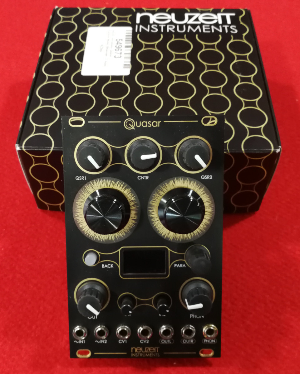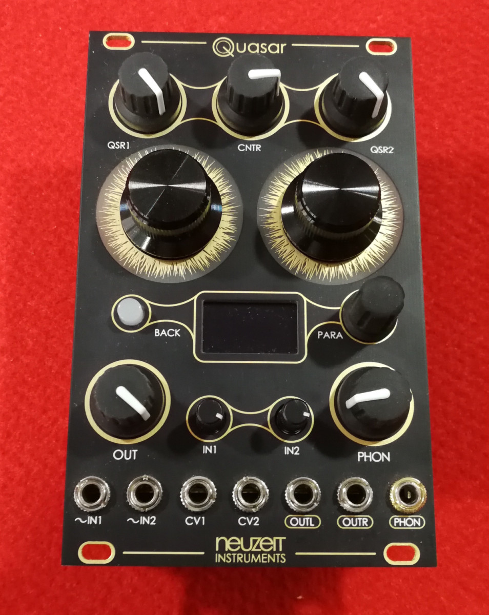 Dos entradas de audio, cada una de las cuales se puede mezclar en las tres rutas de señal Quasar 1, Quasar 2 y Center (cada una con filtro paso bajo/paso alto ajustable)