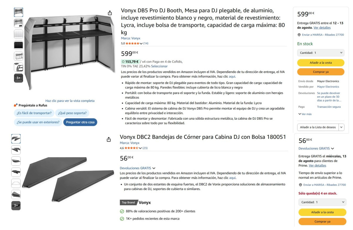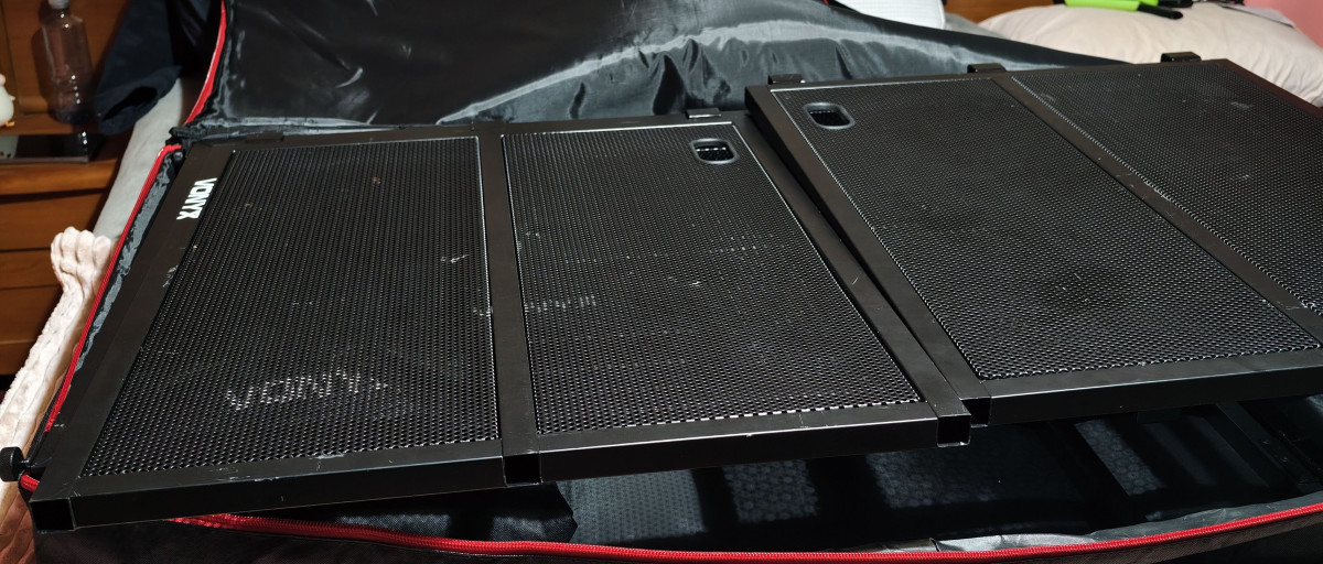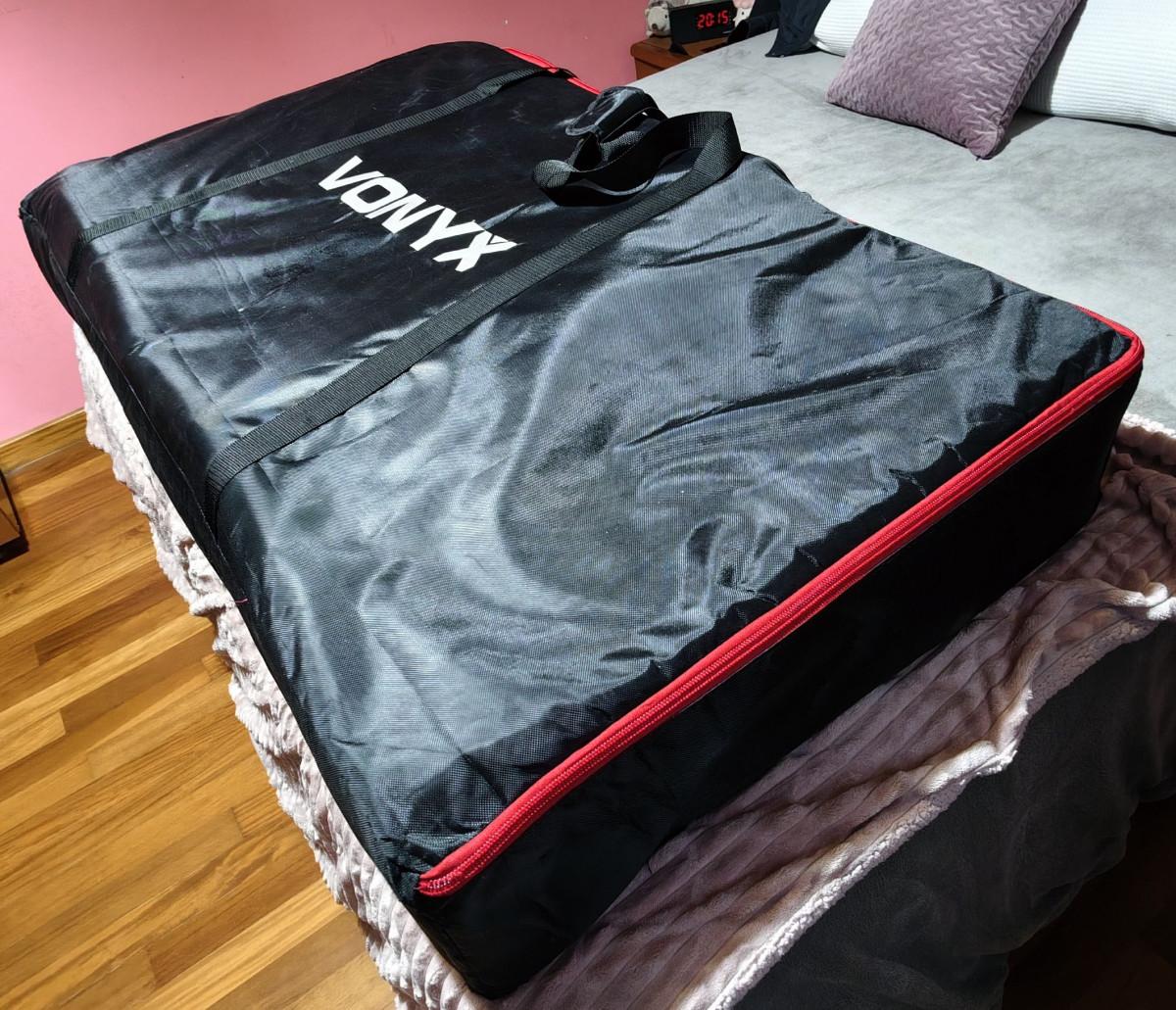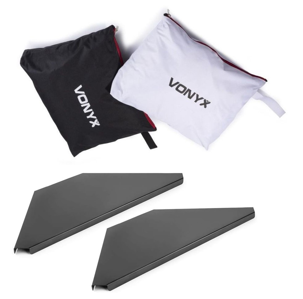 Con sus licras (negra y blanca) y funda de transporte más las dos bandejas esquineras DBC2 para colocar monitores o luces que vende Vonix aparte.