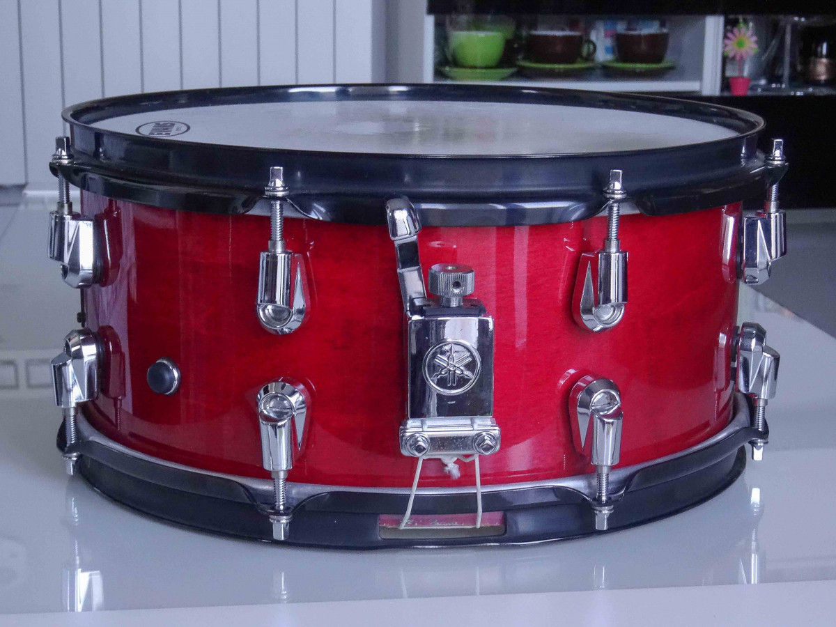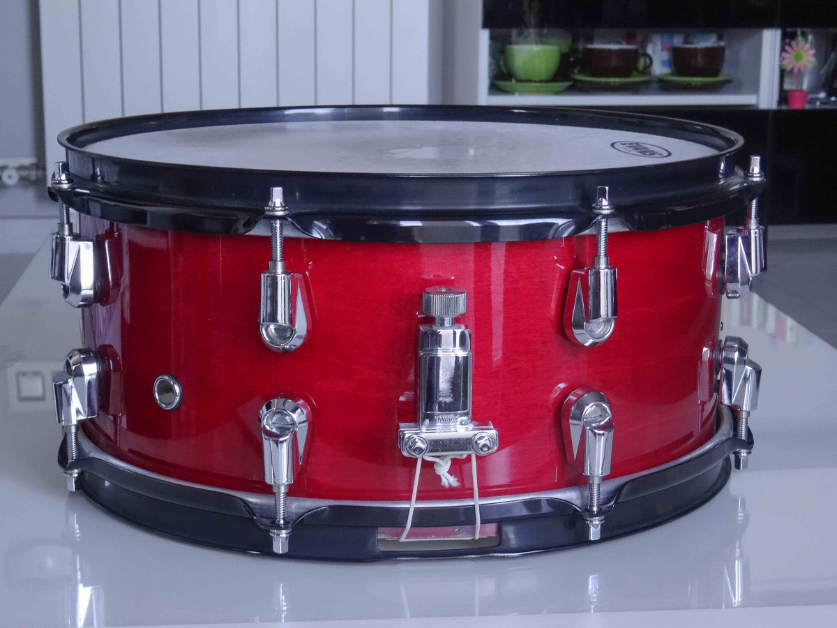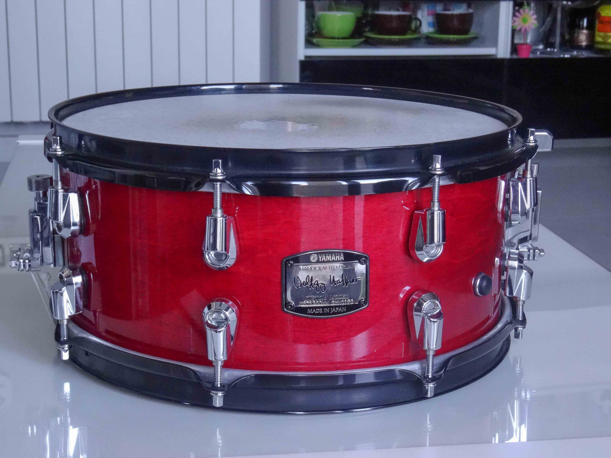 Yamaha MSD1360WH Wolfgang Haffner, Caja Color rojo manzana. Construida con 4 capas de arce y 2 de roble en el interior. Medidas 13" x 6". Aros Dynahoop en negro mate. Ocho bellotas "Nouveau" de liberación rápida. Doble sistema de bordonera con dos palancas. Fabricada en Japón. En perfecto estado. Sonido potente y cálido. Regalo Funda Gewa.