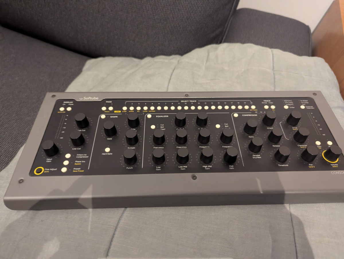 Mixer controlador de Softube. Lo usé un tiempo pero terminé no usándolo, funciona perfecto, una gozada de aparato para mezclar tocando botones y no el ratón mirando la pantalla.