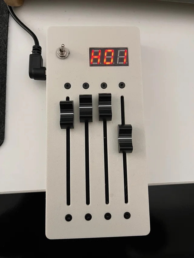 Controlador MIDI con cuatro faders deslizantes de 10 cm de recorrido. El dispositivo cuenta con una pantalla digital y un interruptor.