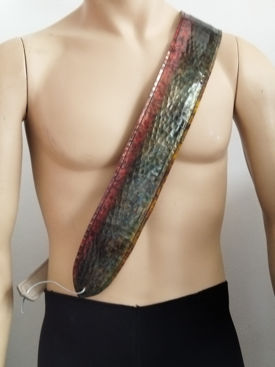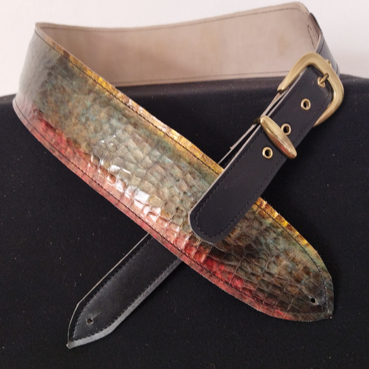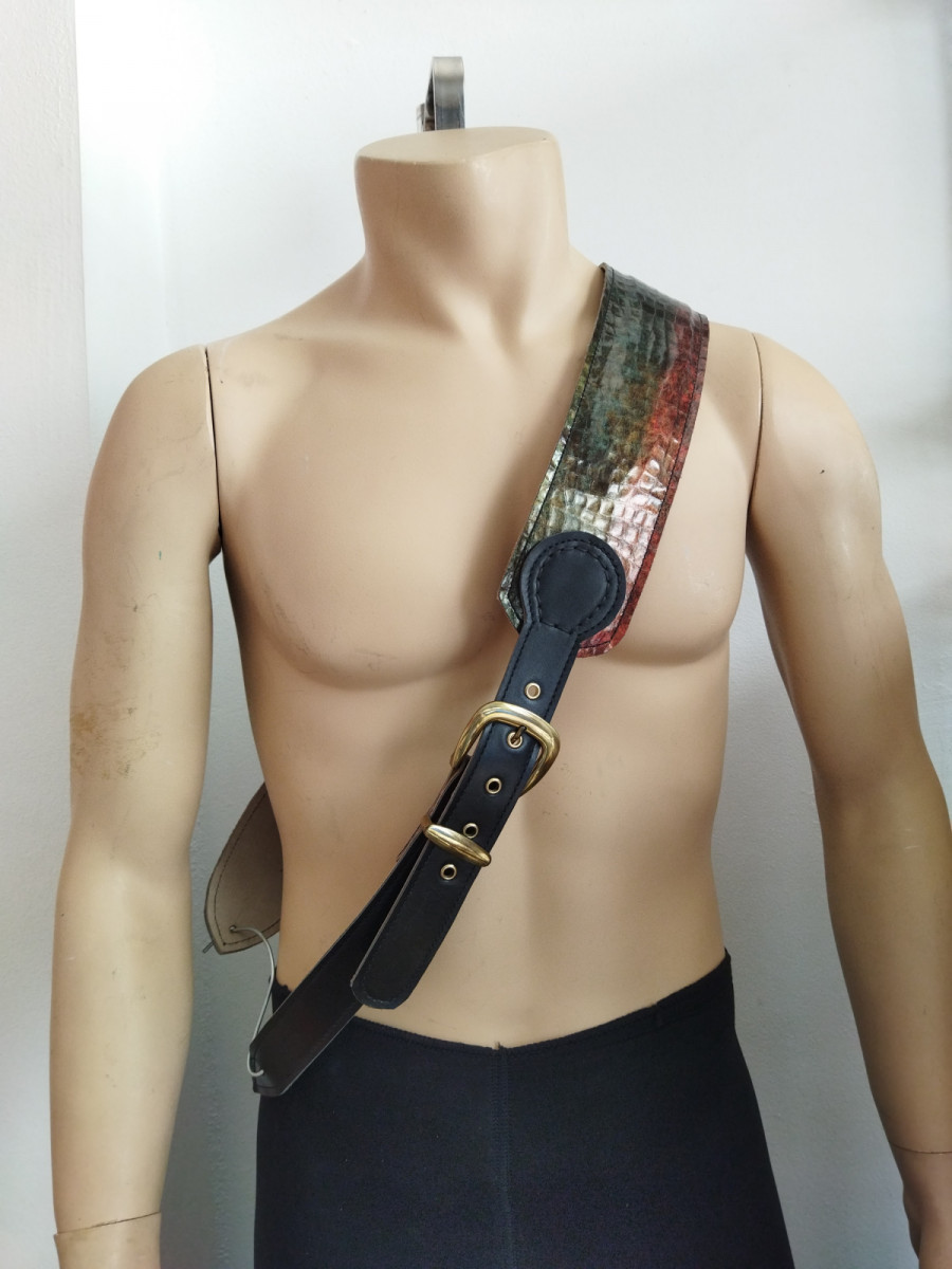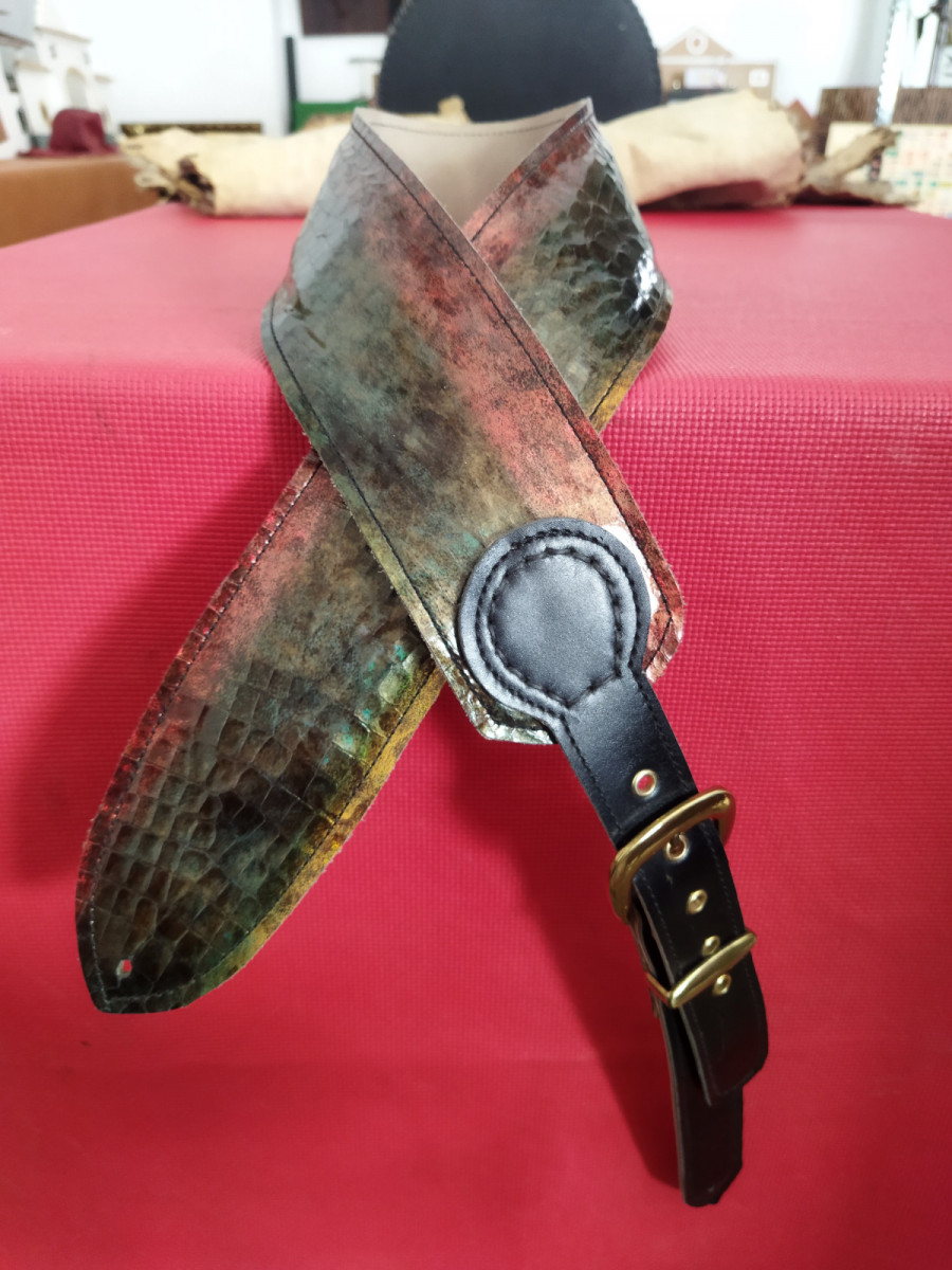 Correa de cuero estampado multicolor. Es un cuero italiano con acabado fantasía , normalmente se usa en zapatería y bolso de alta calidad está forrada con piel y lleva una ligera almohadilla en el interior. Cuando la luz se refleja crea unos tonos destacables.