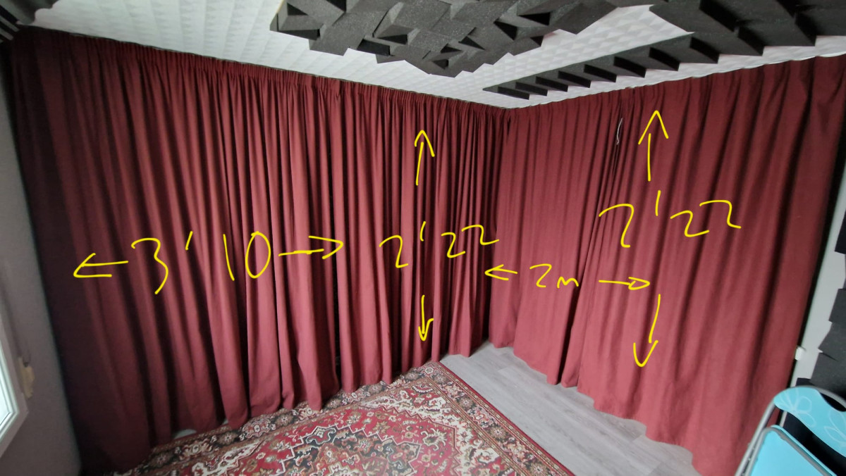 Cortinas acusticas 500g/m2 de color burdeos, ideales para mejorar la acústica de tu estudio o sala.Estan confeccionadas e incluyo tambien los rieles y todo lo necesario para la instalacion oculta como se ve en las fotos . Estan en perfecto estado y han sido instaladas en espacio sin humos.