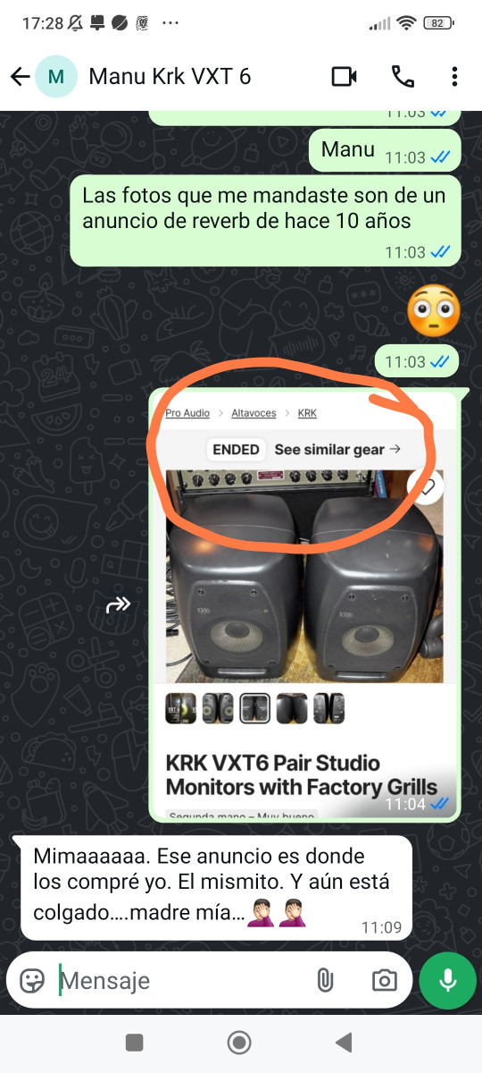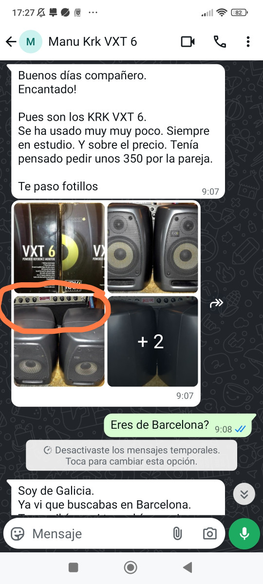 Al pedirle fotos de las escuchas, me han parecido un poco raras por el equipo que se veía de fondo, así que he puesto en google "used krk vxt6" y me han aparecido las fotos en un anuncio de reverb USA de hace 10 años.