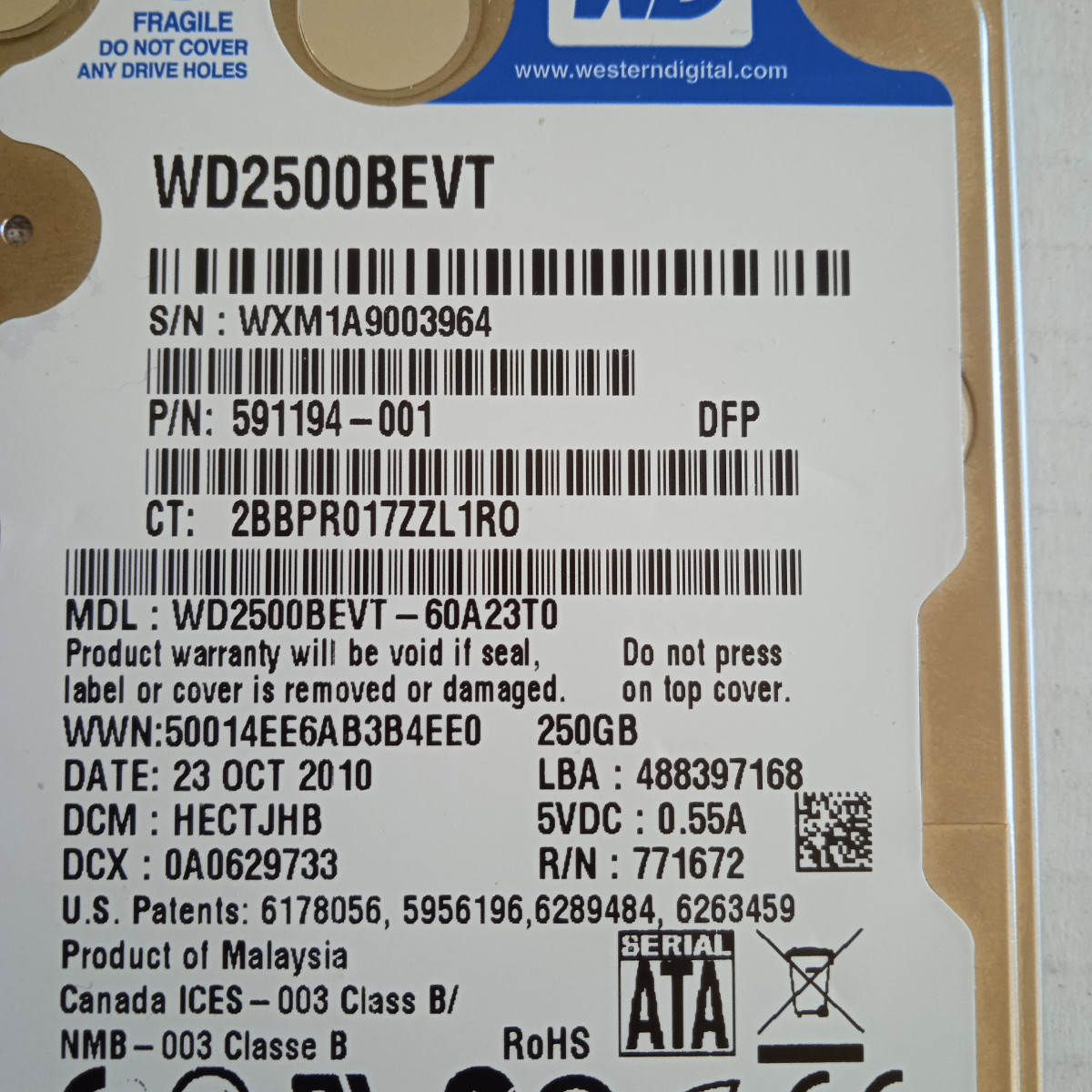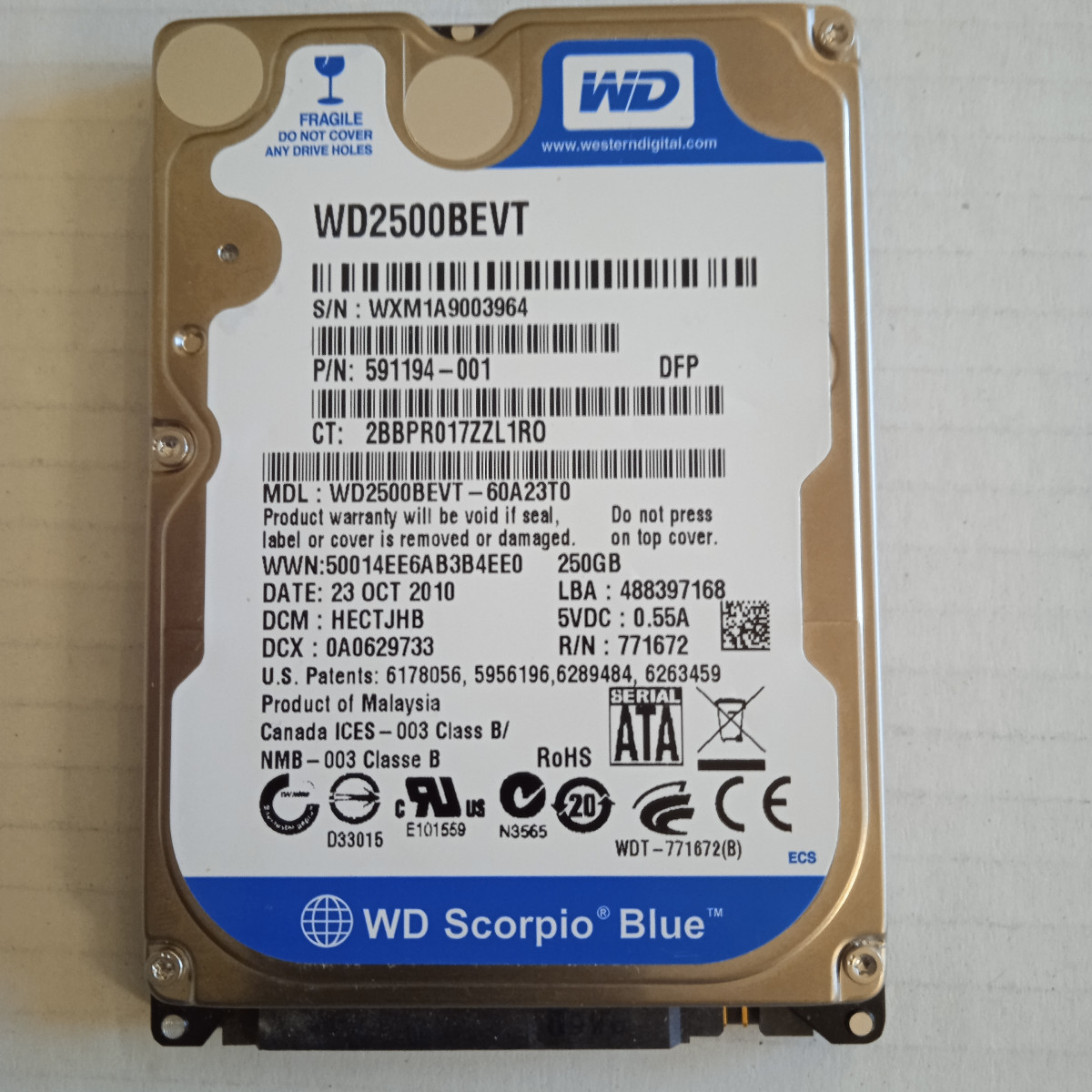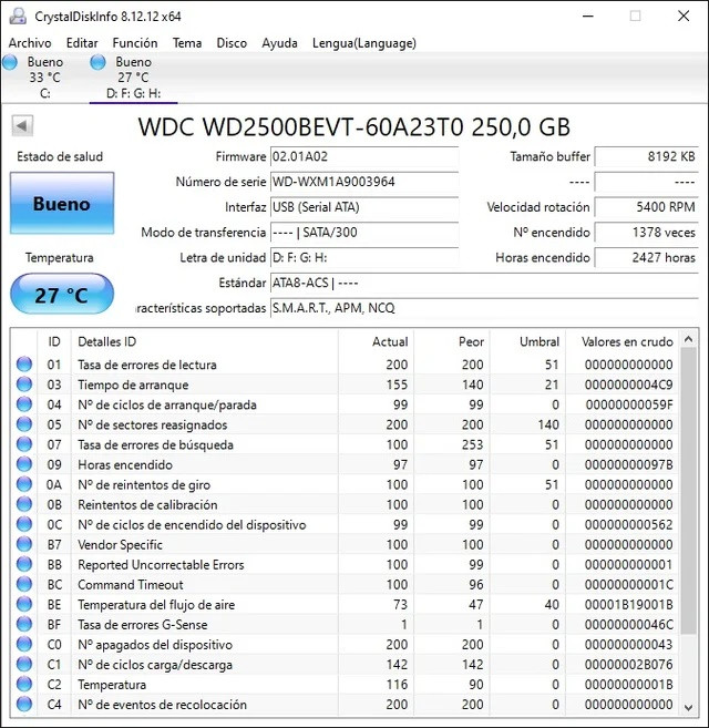 Disco duro 250GB 2,5" WD WD2500BEVT (Test OK)