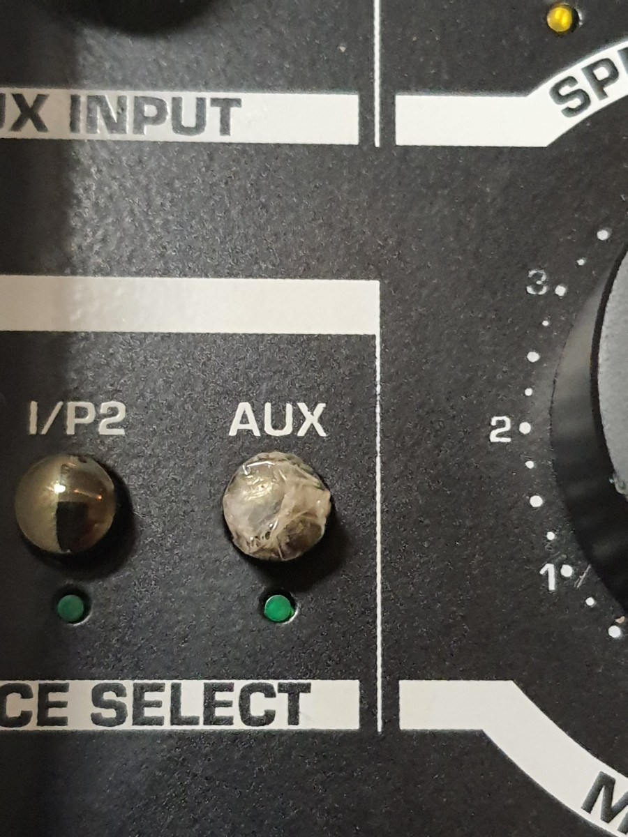 Presenta un botón reparado de forma casera con celo (puramente estético, no afecta al uso).