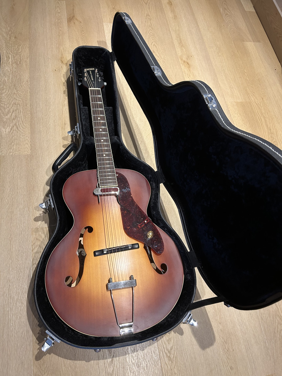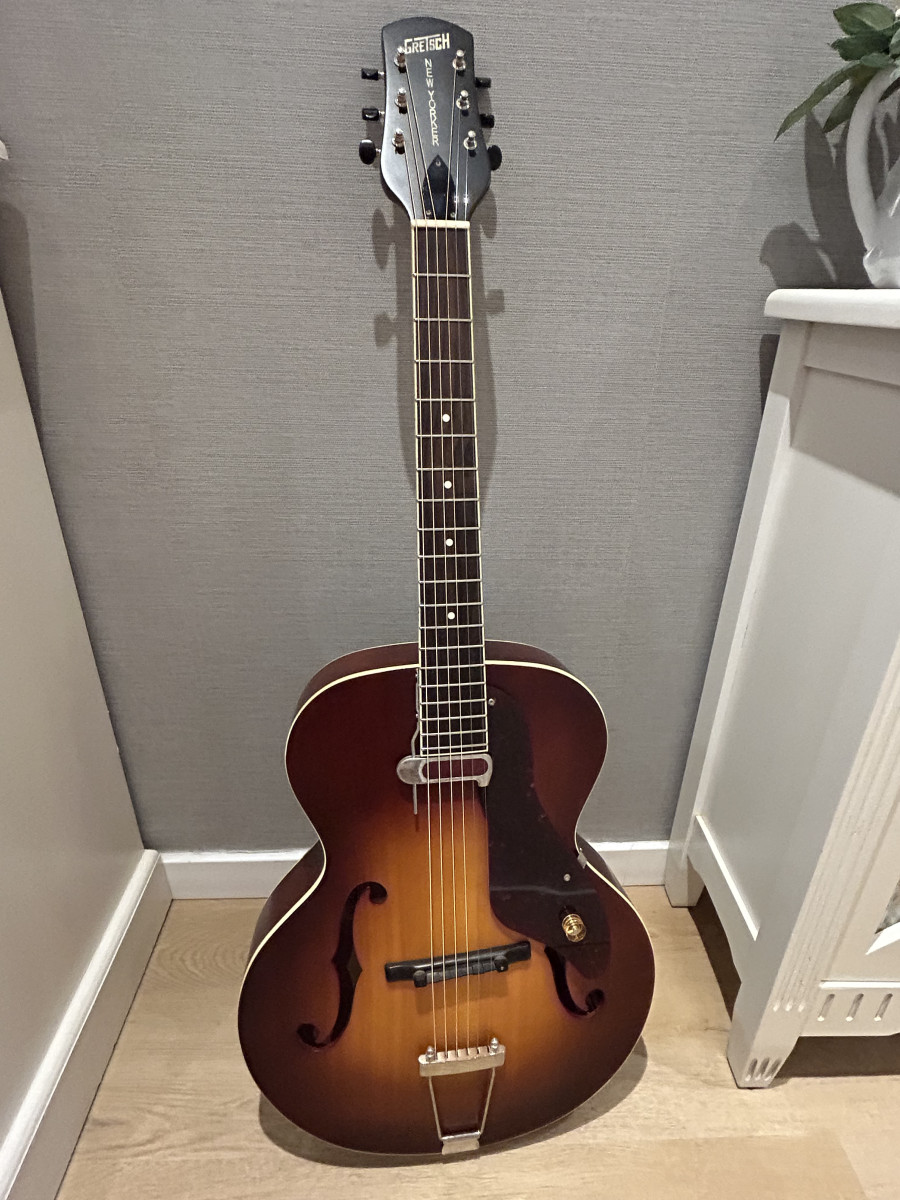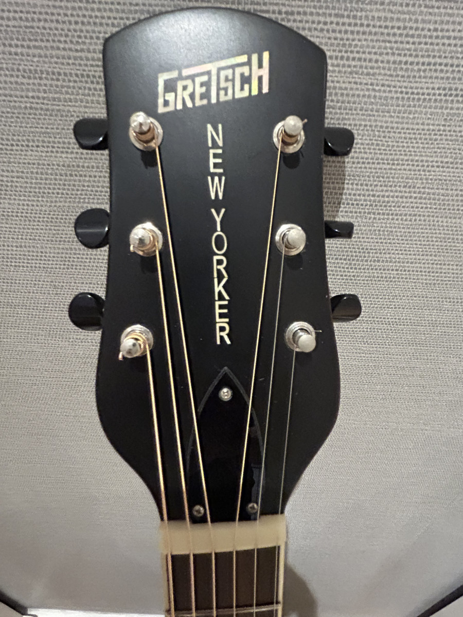Electroacústica Gretsch New Yorker G9555 en perfecto estado. De diseño vintage estilo 50s, cuerpo hueco con tapa de abeto macizo y pastilla de bobina simple. Se trata de una guitarra con un sonido algo más oscuro de lo habitual para una acústica, lo que la da una dinámica más completa y redonda. Se le ha dado muy poco uso y está recién revisada por luthier. Se puede probar sin compromiso en Castellón. Incluye estuche rígido en muy buen estado.