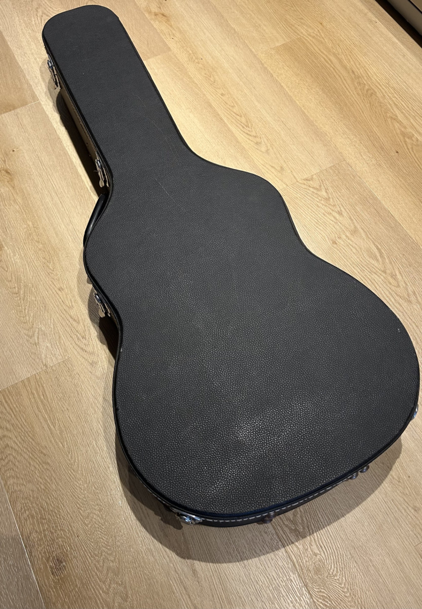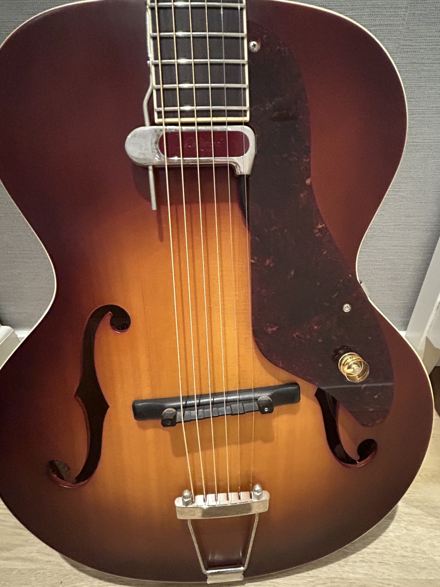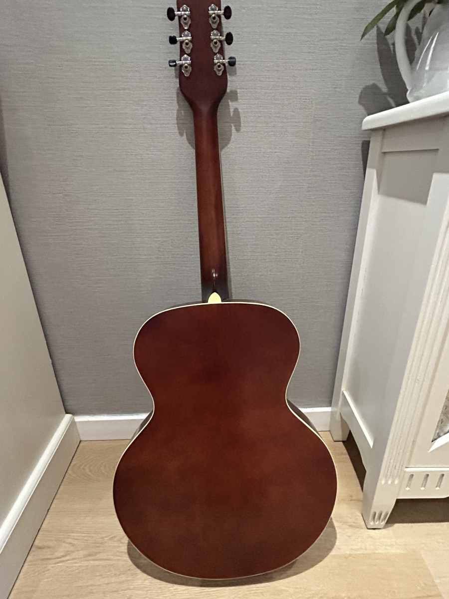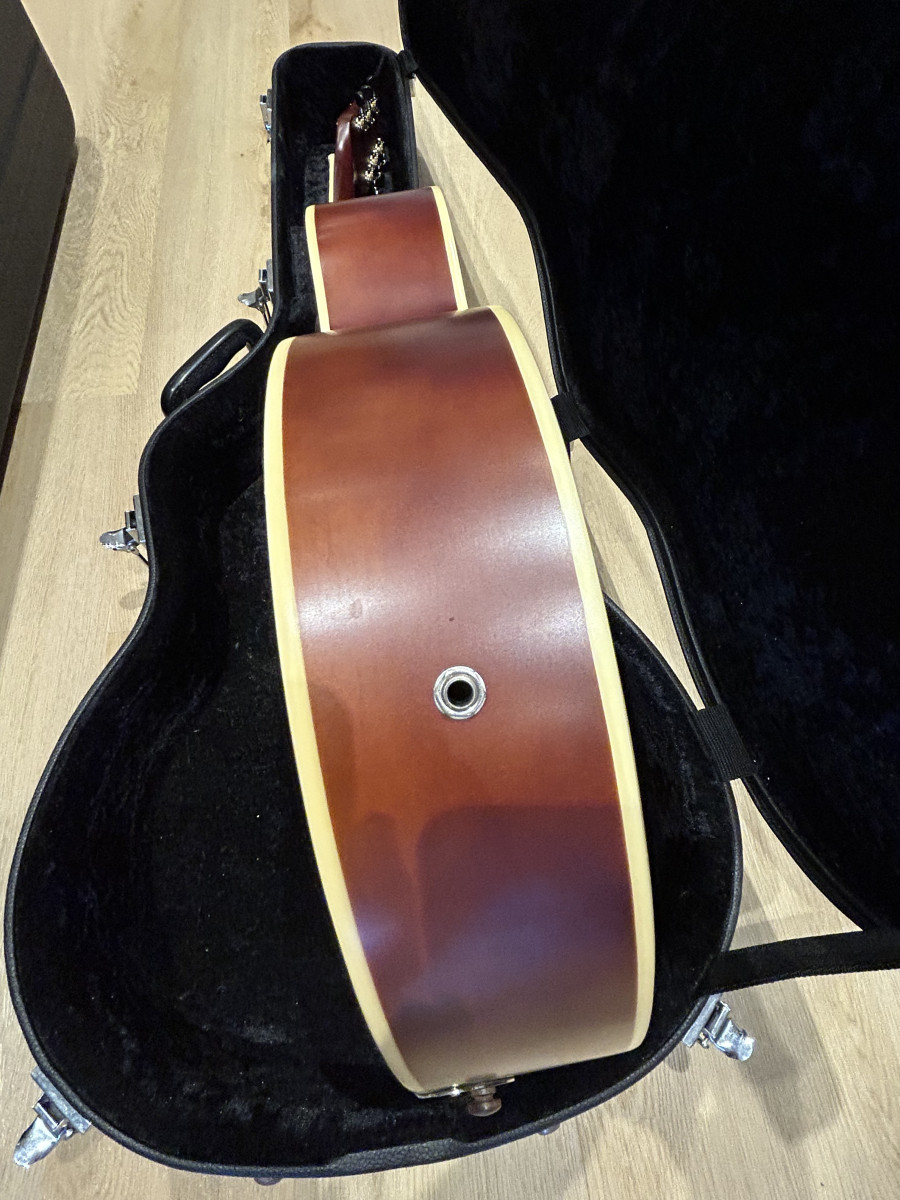 Electroacústica Gretsch New Yorker G9555 en perfecto estado. De diseño vintage estilo 50s, cuerpo hueco con tapa de abeto macizo y pastilla de bobina simple. Se trata de una guitarra con un sonido algo más oscuro de lo habitual para una acústica, lo que la da una dinámica más completa y redonda. Se le ha dado muy poco uso y está recién revisada por luthier. Se puede probar sin compromiso en Castellón. Incluye estuche rígido en muy buen estado.