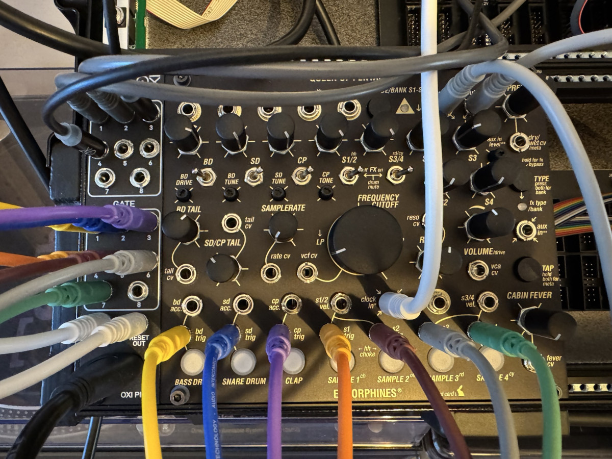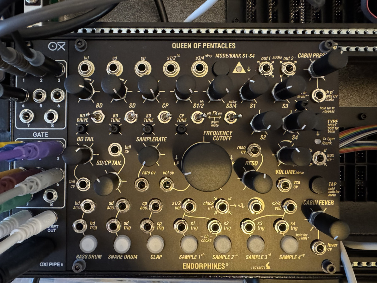 Vendo Queen of Pentacles, módulo de batería Eurorack inspirado en la TR-909 que combina tres fuentes analógicas y cuatro basadas en muestras. Integra reproducción de samples directa desde tarjeta SD sin latencia, procesador de efectos a bordo y filtro tipo “isolator”.