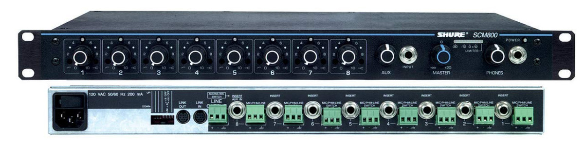 Meczlador de micófonos de 8 canales SHURE, con alimentación PHANTOM en cada canal. Conexión en cascada de hasta 4 SCM 800. Inserción por canal, limitador de pico de salida balanceada. Salida con nivel de línea.