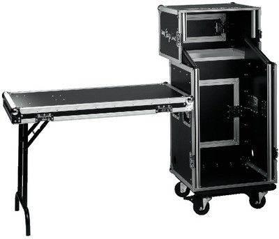 Rack profesional con ruedas para unidades de 482mm (19"), con mesa integrada. Diseño funcional que permite transportarlo de modo seguro y con un breve tiempo de montaje y desmontaje. Los raíles están equipados con un sistema anti-deslizante sobre una base de caucho, evitando así definitivamente el deslizamiento de las tuercas.