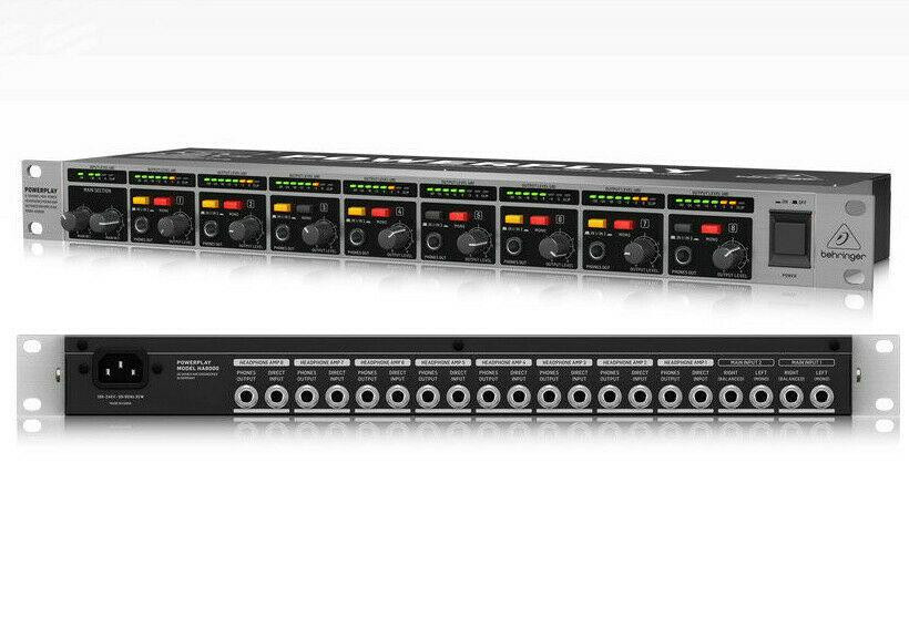 Amplificador de auriculares y mixer de 8 canales. 2entradas estéreo. Estas conexiones principales permiten realizar mezclas independientes. 8 entradas. Permiten realizar hasta 8 mezclas estéreo de forma individual. Salida de auriculares 1/4'' por cada canal ubicadas en el panel frontal.