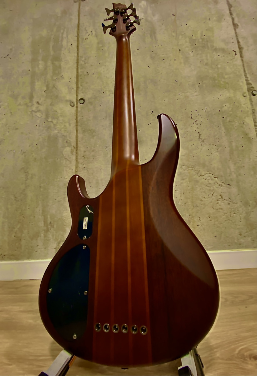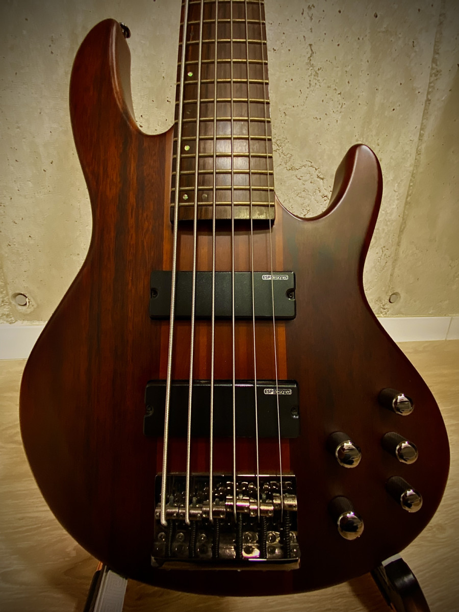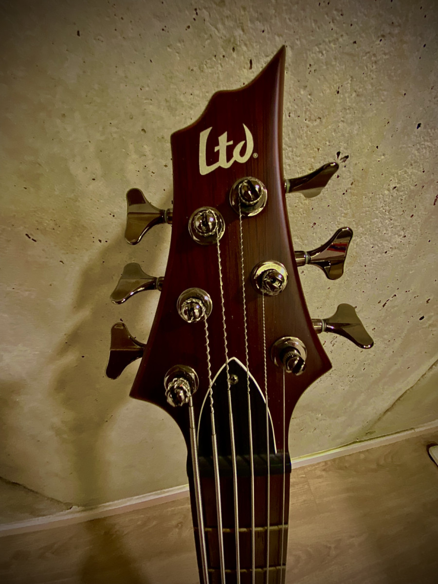 Bajo de 6 cuerdas, neck-thru de madera de merbau y mástil de arce y caoba, diapasón de palorrosa. La electrónica y pastillas son un diseño propio de ESP basado en EMG, de echo suena practicamente igual a las EMG 35DC pero no tan agresivas, con un tono más calido y más compacto en el registro grave como en el agudo.