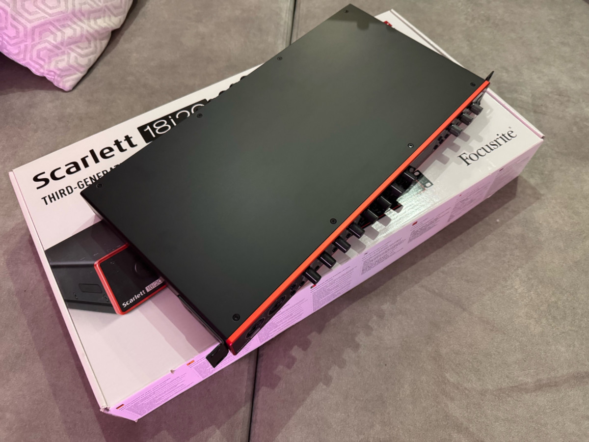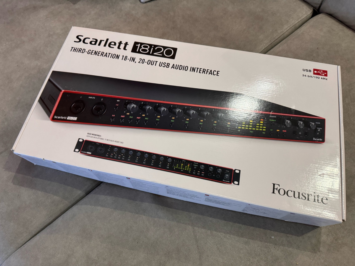 Interfaz de audio Focusrite Scarlett 18i20 de tercera generación. Diseñada para estudios profesionales y músicos. Está inmaculada, uso en estudio local sin humos. Tiene hasta el plastiquito encima, puedes darte el placer de quitarlo.