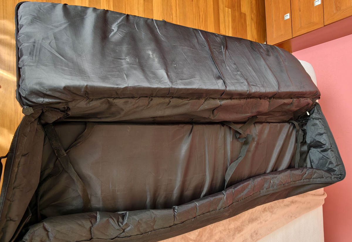 Usada en varias giras tiene algunos rasgones en el nylon, pero hace su función al 100% igual que el primer día, es lo más parecido a llevar un flightcase pero con un peso ligerisimo.
