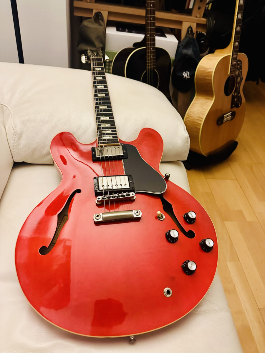 Gibson 335, preciosa guitarra el modelo es Antique Faded Cherry, pastillas Memphis Historic Spec I MHS Custom Shop. Puente ABR1 puente con selletas de titanio, cejuela de hueso, cordal tailpiece tuneomatic, mastil con diapasón de rosewood, esta ligeramente redondeado para una comodidad deliciosa, con su estuche marrón de piel, gran sonido y gran comodidad. Papeles y documentos por supuesto