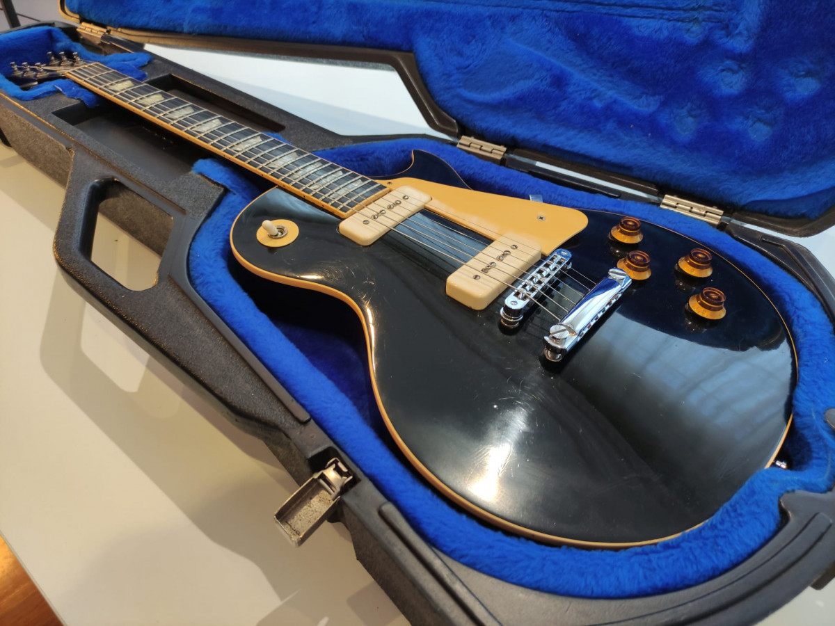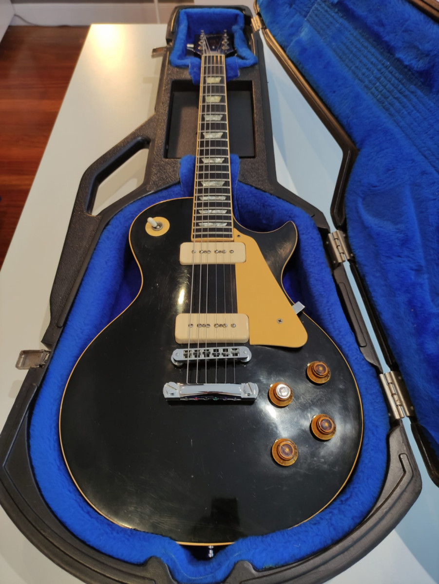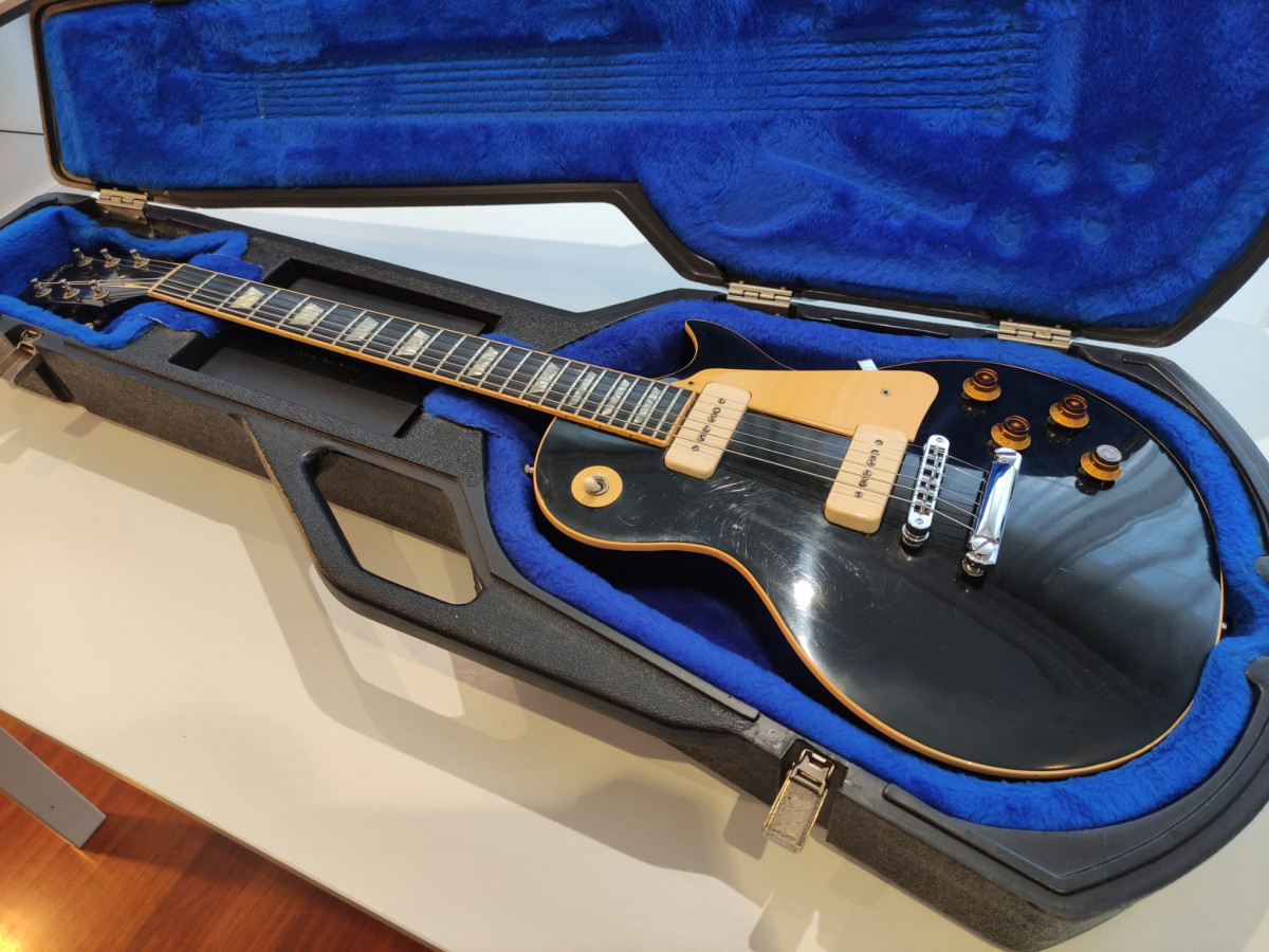 Gibson Les Paul Deluxe Pro de 1980 acabado Ebano (1976-1982). Una de las joyas que fabricó Gibson. Con sus pastillas p90 tiene un tono increíble, muy buscado por los coleccionistas. La guitarra está en perfecto estado de funcionamiento, tiene la acción muy baja. La tapa de la pala no es original, el resto sí.