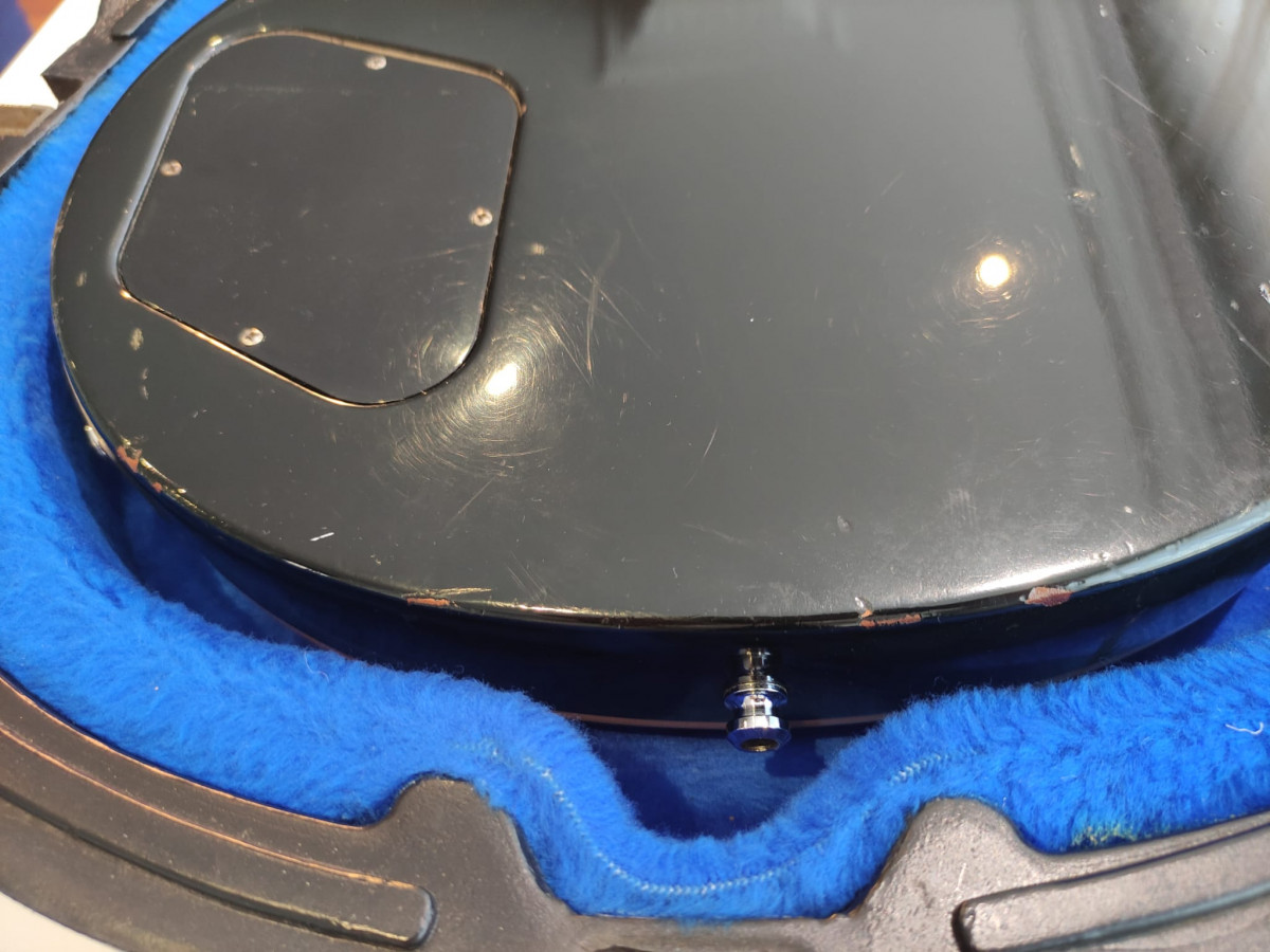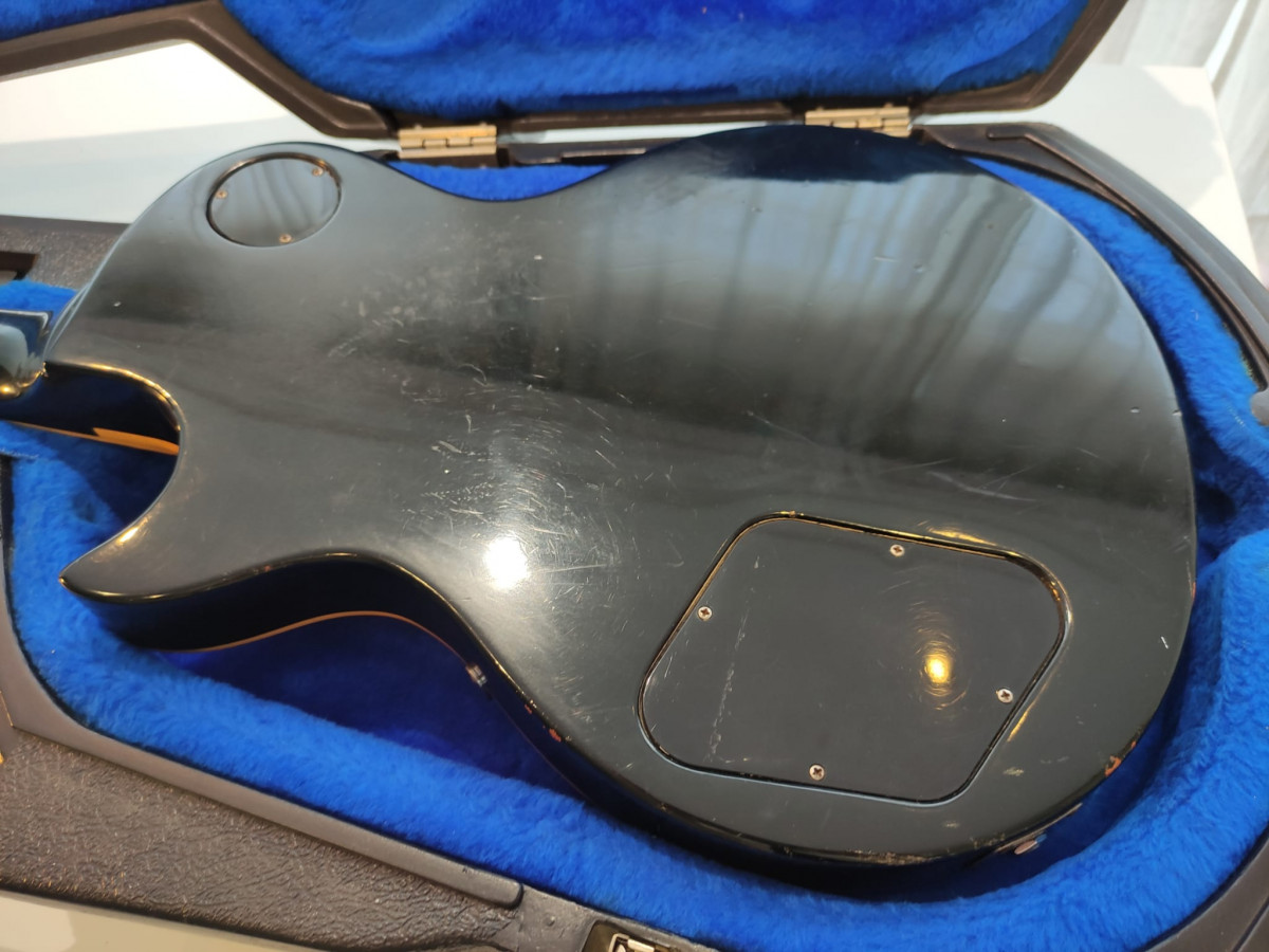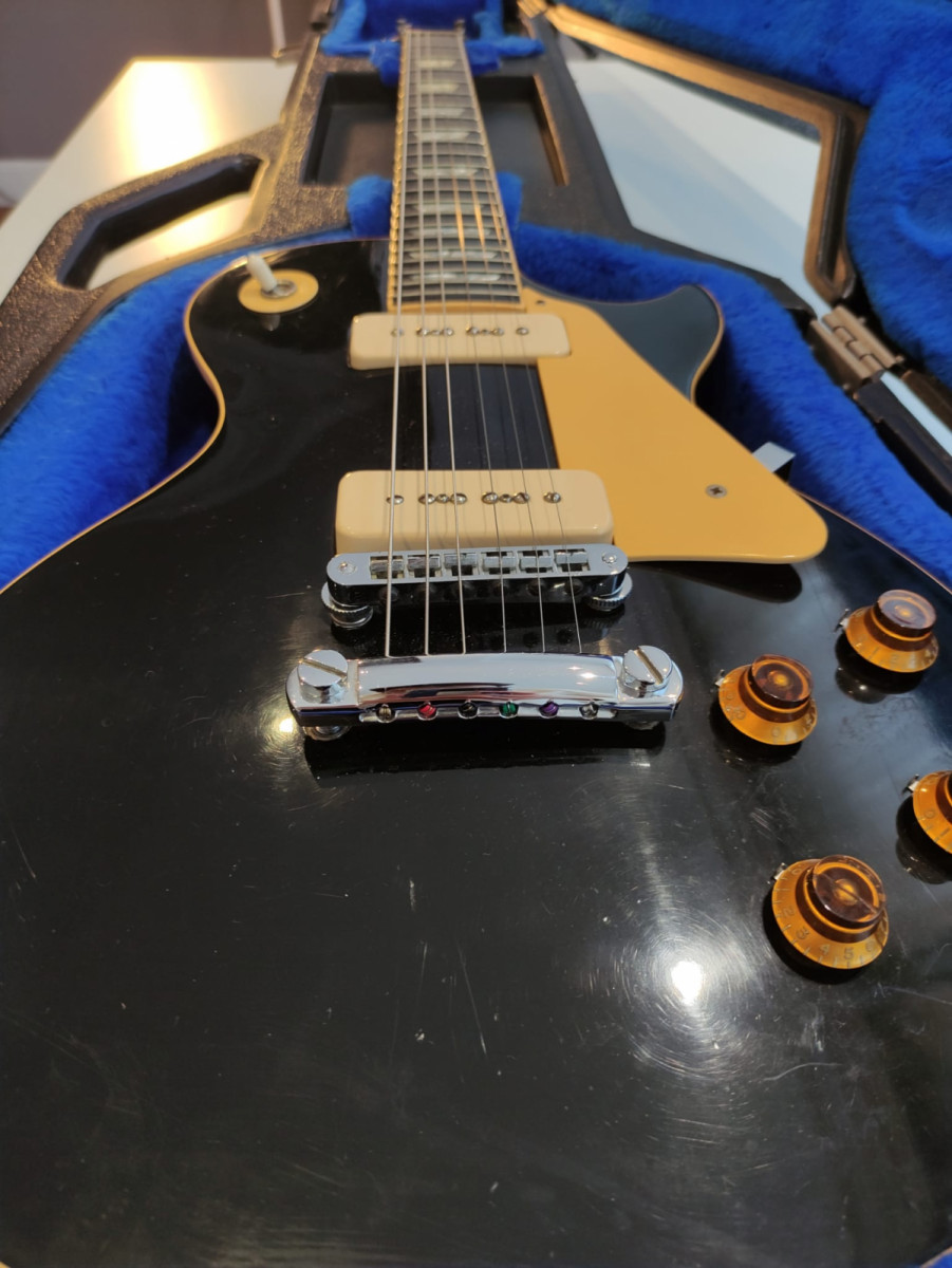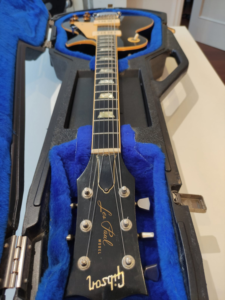 Gibson Les Paul Deluxe Pro de 1980 acabado Ebano (1976-1982). Una de las joyas que fabricó Gibson. Con sus pastillas p90 tiene un tono increíble, muy buscado por los coleccionistas. La guitarra está en perfecto estado de funcionamiento, tiene la acción muy baja. La tapa de la pala no es original, el resto sí.