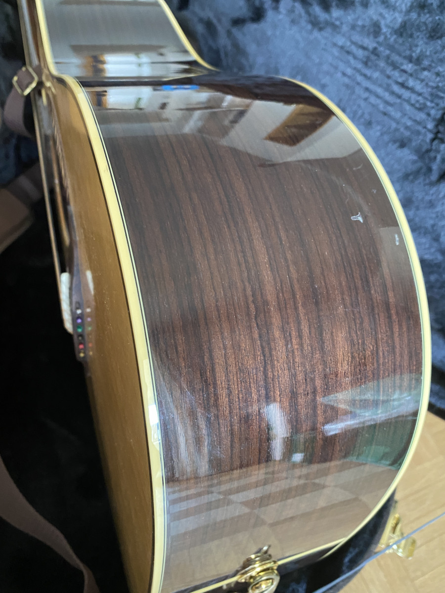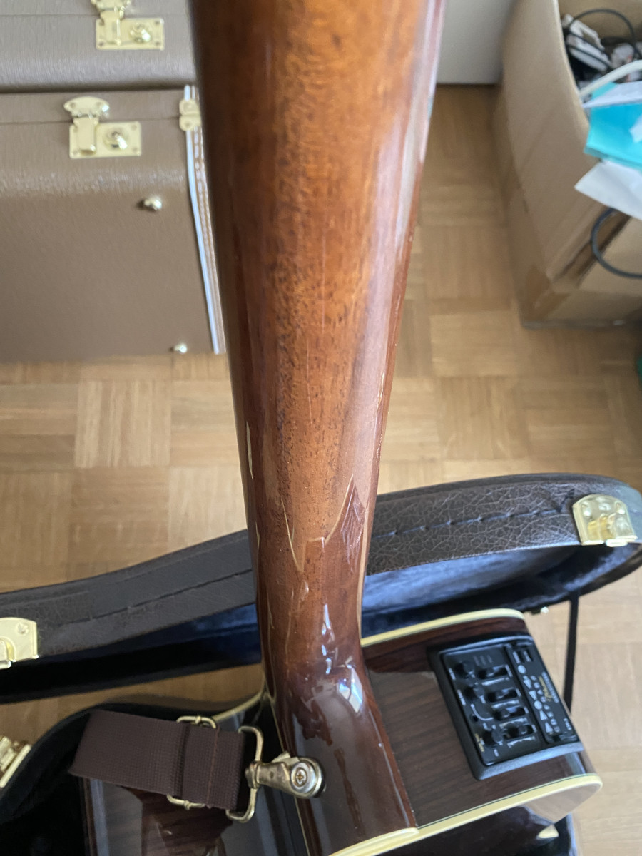 El estado de la guitarra es excelente y puede verse en las fotos. Solamente tiene una pequeña marca de un roce de las pocas veces que se ha sacado y se haya rozado ya que el lacado que tiene es muy delicado (se adjunta foto detalle). Por lo demás está impecable y como nueva; lista para que le deis el uso que se merece.