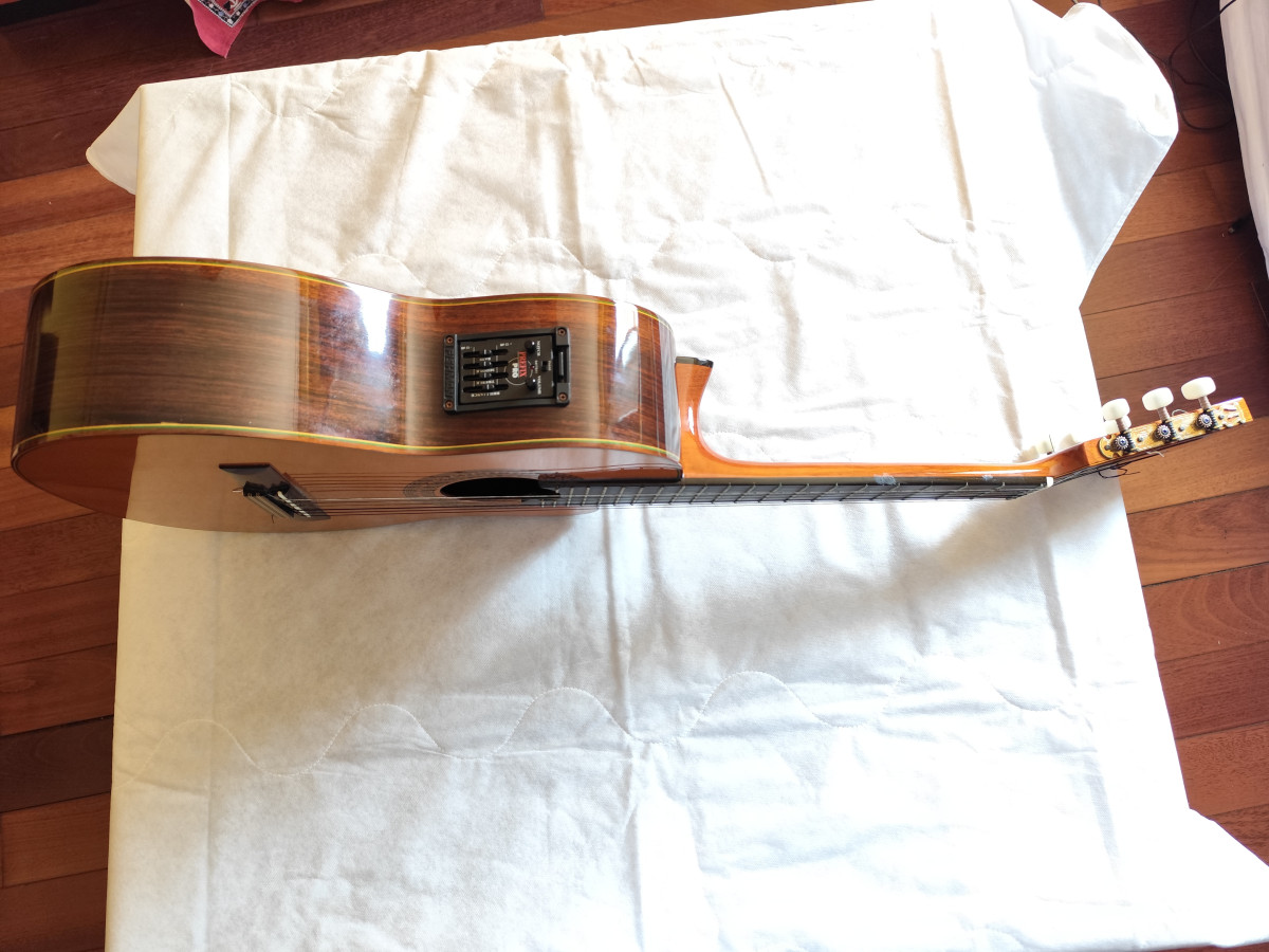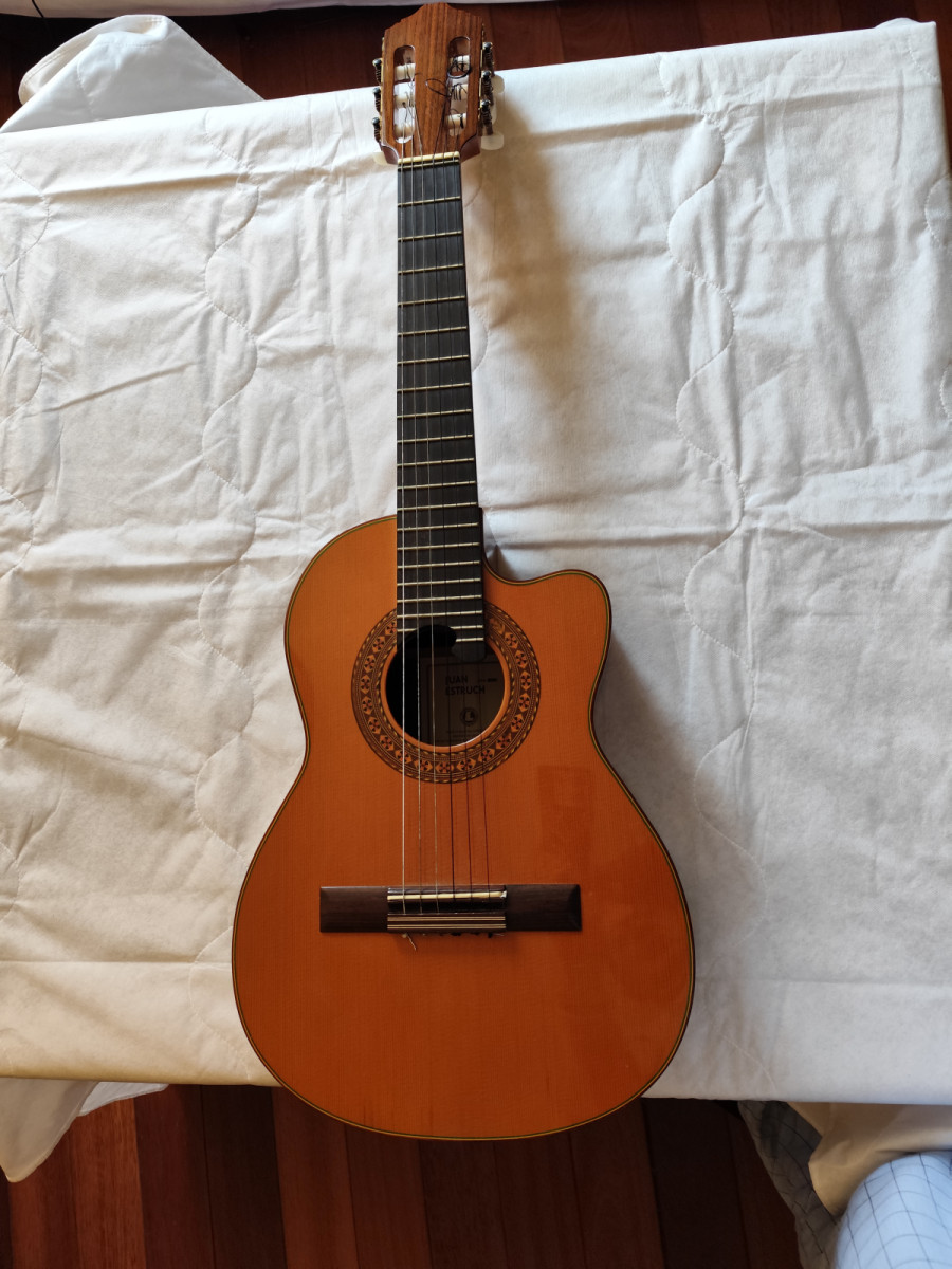 guitarra requinto año 2000, JUAN ESTRUCH. En la zona de abajo tiene unos puntos de tornillos disimulados con una peqgatina. Sonido excelente