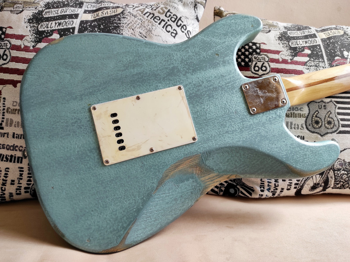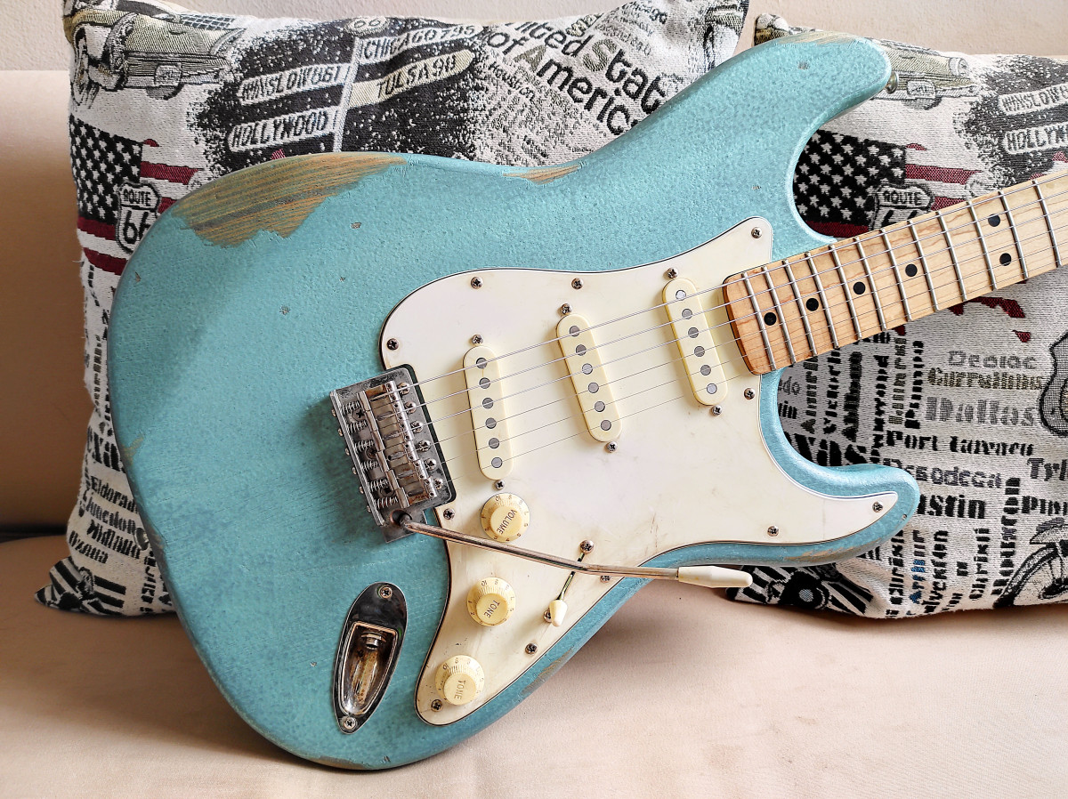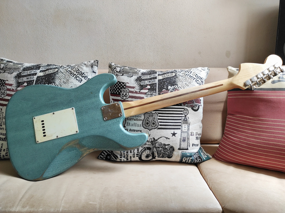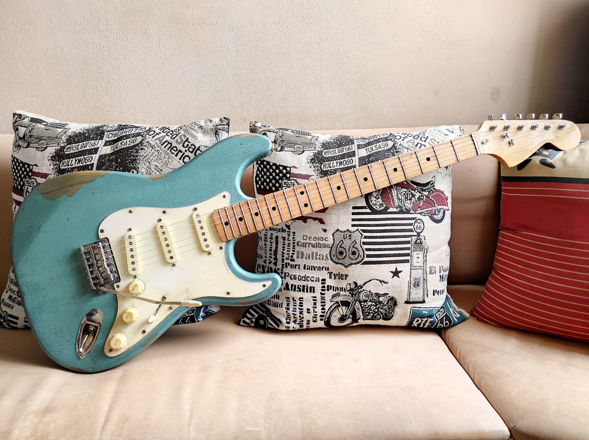 Guitarra Stratocaster estilo años 70 (el mástil es de esa época) hecha con las maderas correctas, relic / envejecido artificial moderado y buenos herrajes y pastillas (los componentes respetan todas las "specs" del diseño original y eso se refleja en su sonido).