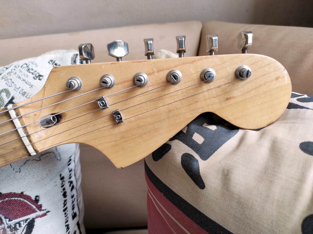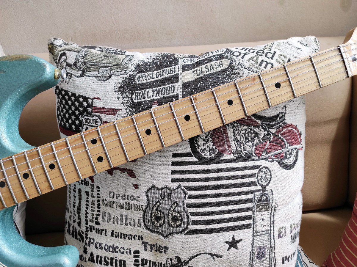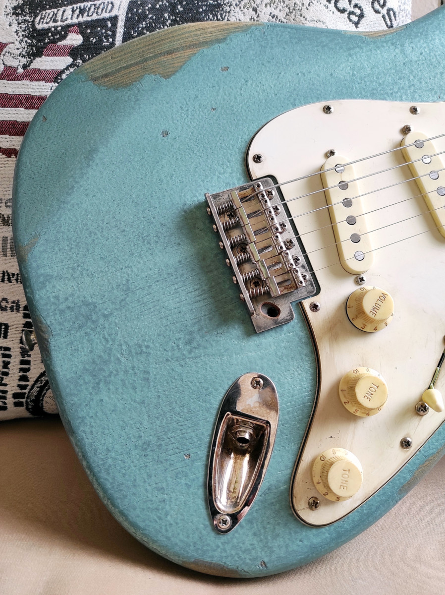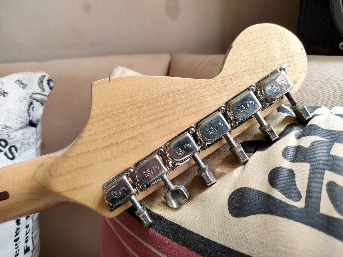 Guitarra Stratocaster estilo años 70 (el mástil es de esa época) hecha con las maderas correctas, relic / envejecido artificial moderado y buenos herrajes y pastillas (los componentes respetan todas las "specs" del diseño original y eso se refleja en su sonido).