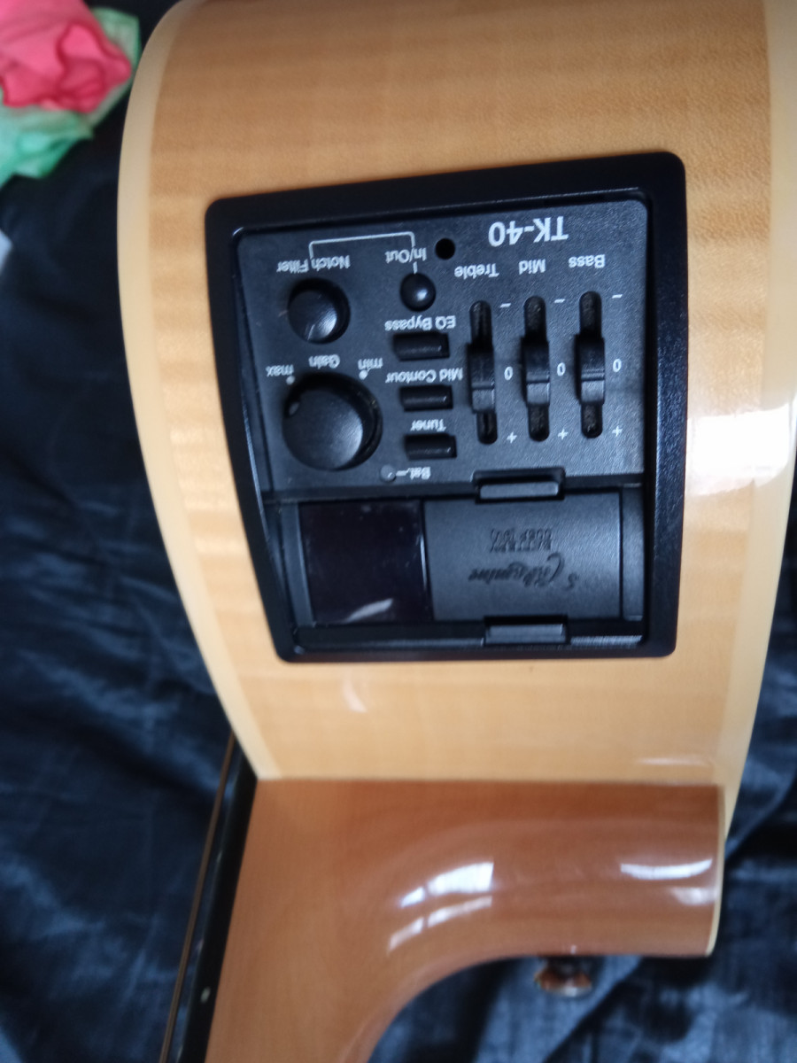 El preAmplificador de Takamine TK40 encontrado en serie g control de volumen de características de Guitarras, bajo, medio y agudos controles deslizantes frecuencia, EQ omitir, un filtro Notch, afinador y un conmutador medíados de contorno. El preAmplificador está encendido por conectar un cable de instrumento mono estándar 1/4"en el endpin Correa/jack de pines. Estas cuatro últimas funciones se describen con mayor detalle a continuación: