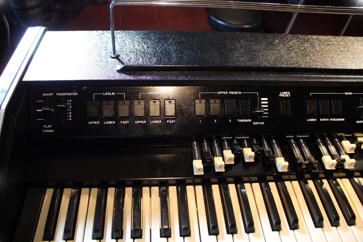 Drawbars (2x9: 16', 5&1/3, 8', 4', 2&2/3', 2', 1&3/5', 1 y 1/3, 1'), tono (+/-50 %), transposición (+2 y -4 semitonos), control Leslie (externo), coro (lento/rápido), 3 preajustes en el teclado superior + barras de tono, 1 preajuste en el teclado inferior + barras de tono, bajo (manual inferior o pedalera - 2 tiradores 16 y 8') + voz de sintetizador con sustain, percusión y resonancia, «clic de tecla»/percusión 2.ª y 3.ª armónicas con sustain y volumen (manual superior), (salida general) «calidez» (saturación).