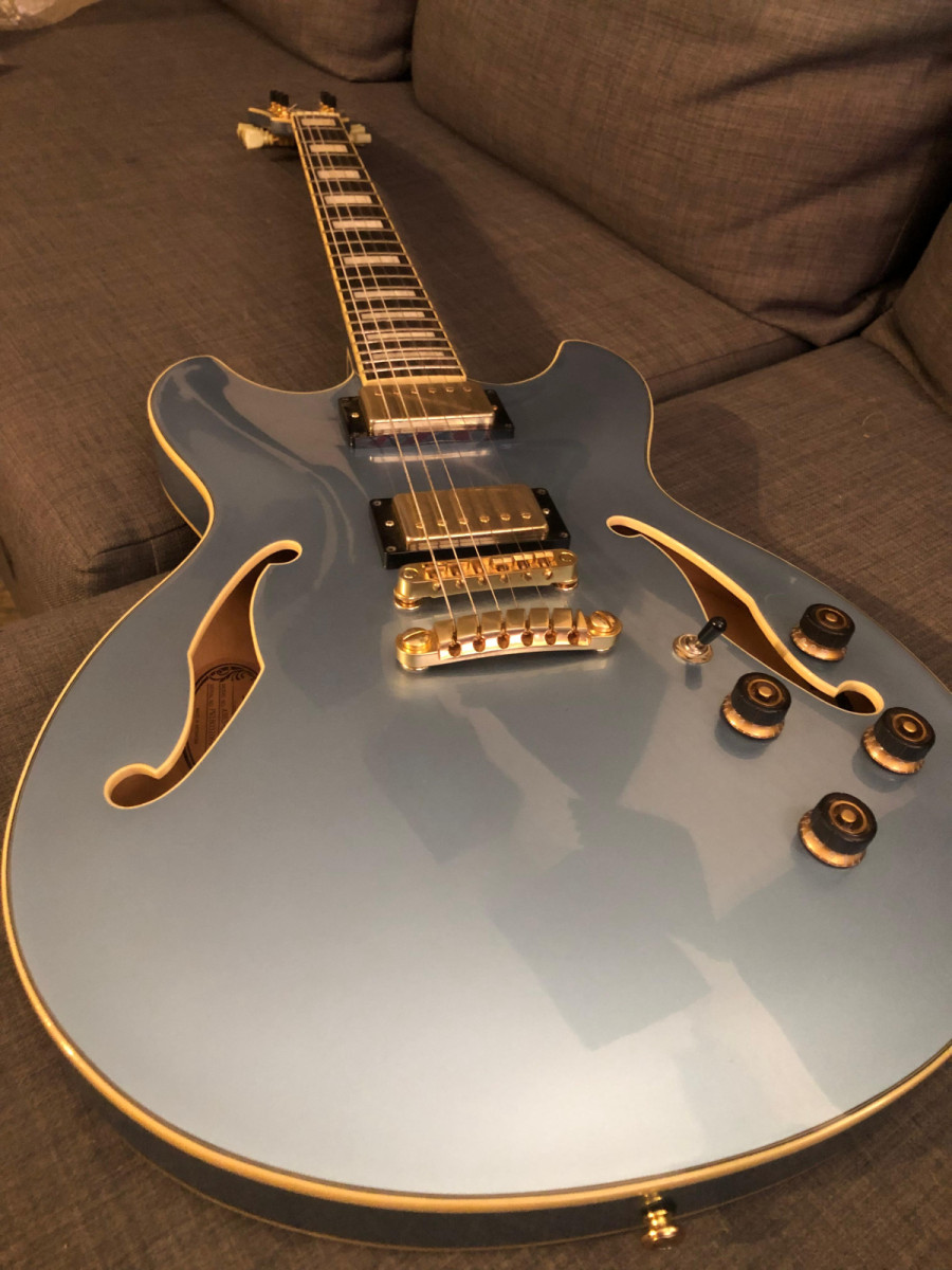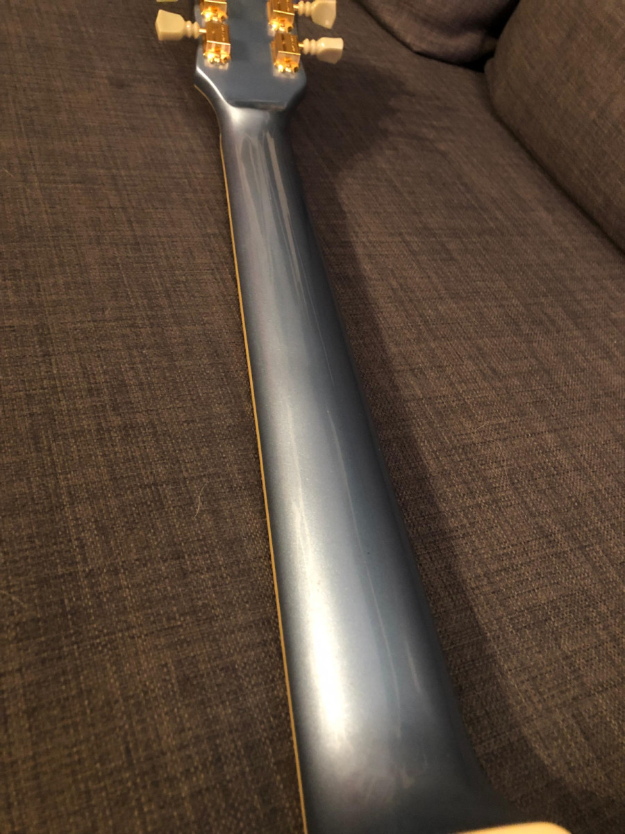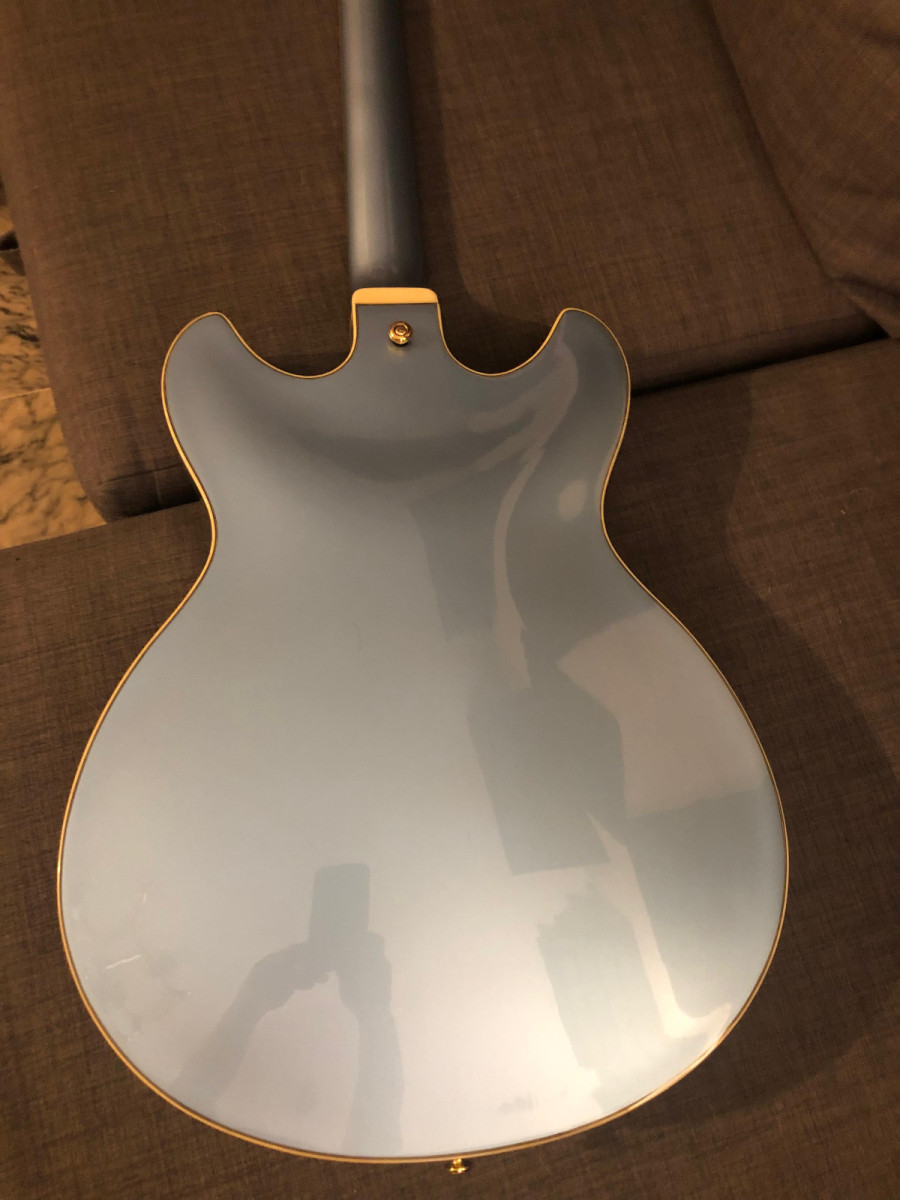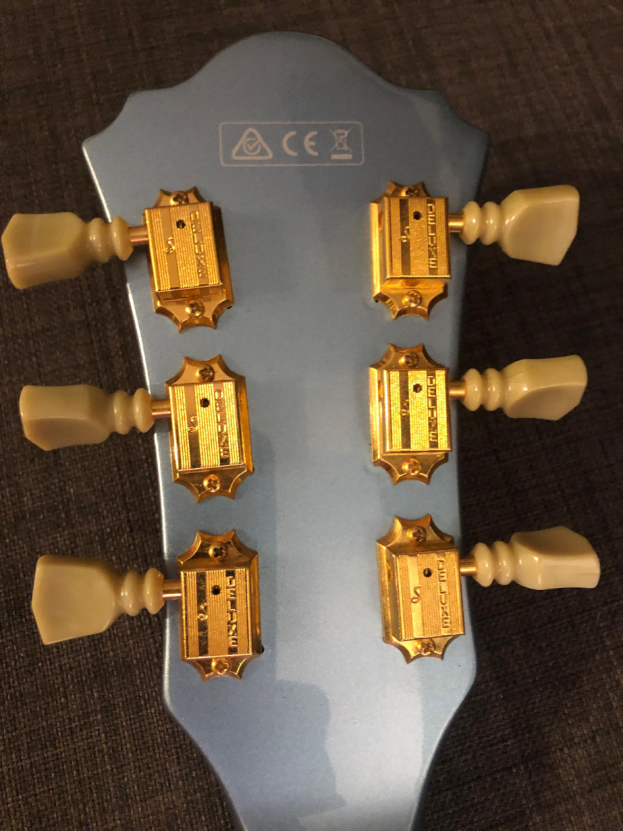 Acabados en azul claro tipo “Light Blue Burst” y herrajes dorados, incluyendo puente Gibraltar