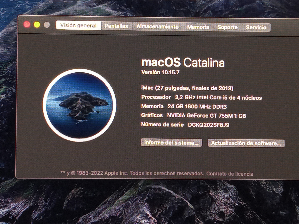 Ordenador IMAC 27" finales año 2013, Procesador: 3.2 GHz Intel Core i5 de 4 núcleos, 24 GB memoria RAM 1600 MHz DDR3, Grafica: NVIDIA GeForce GT 755M 1GB
