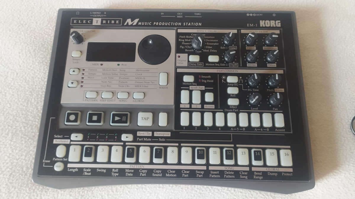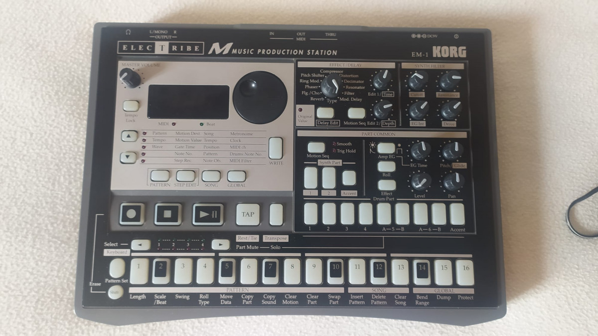 Vendo Korg Electribe EM-1 con su cargador original. La negra. Es toda una joya, no se ven tantas como la roja o la azul. Funcionamiento perfecto. Estado estético muy bueno, serigrafías intactas. Es una máquina muy divertida y vigente a pesar de sus limitaciones, pero he decidido deshacerme de todo mi hardware y pasarme a 100% in the box. Regalo cable midi 5 pin y dos cables jack que olvidé incluir en las fotos.