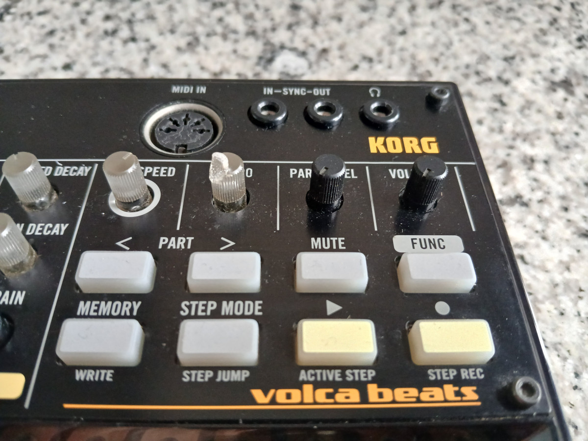 Caja de ritmos analógica Korg Volca Beats, con la popular modificación que mejora el sonido del snare drum. En muy buen estado salvo por la perilla de tempo, que fue dañada ligeramente por el técnico que realizó la modificación al rozarla con el soldador. Sin embargo, incluyo una perilla transparente que disimula el defecto (las que van en las perillas de part level y volume están puestas para que no desentone tanto estéticamente). Incluye caja original y manual de instrucciones.