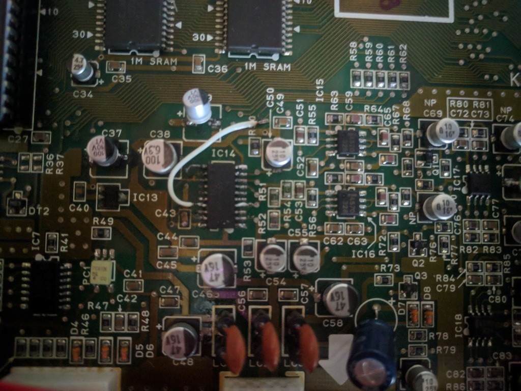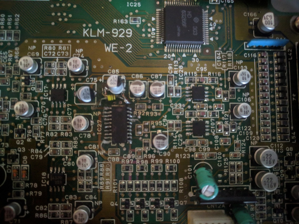 La placa principal ha sido reparada, se le han cambiado los DAC, algunos condensadores y alguna pista resoldada debido a un derrame de electrolito de uno de los condensadores.