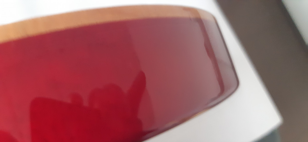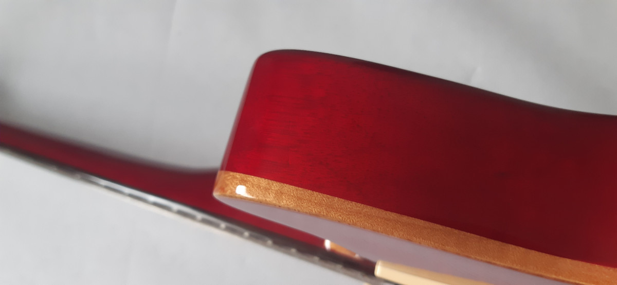 La guitarra está prácticamente de tienda. No tiene desperfectos que se vean a simple vista, aunque mando un par de fotos con "rayitas" que no se notan si no te fijas bien (de hecho no han tocado ni el barniz).