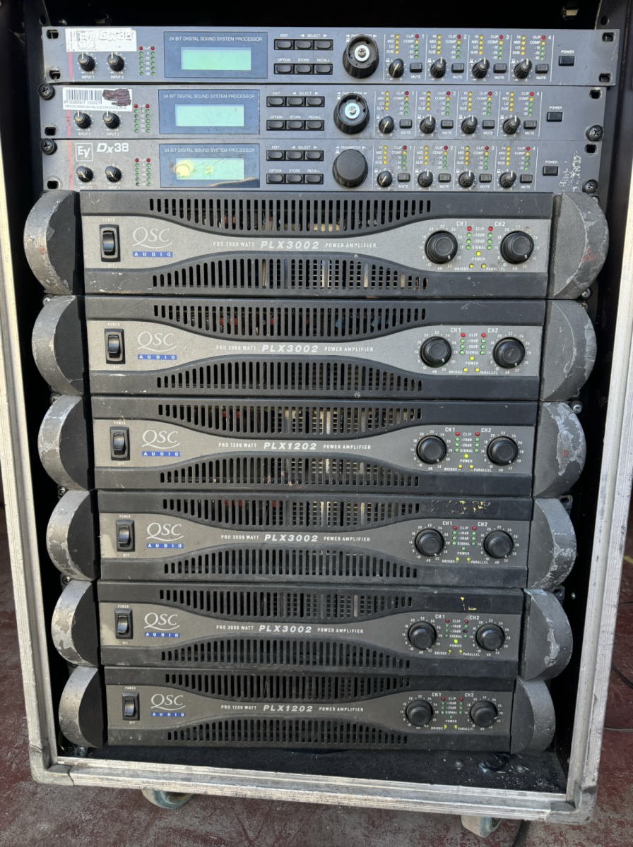 Rack de etapas QSC incluido. Dispone de 3 procesadores (L+R+ 1 de spare)
