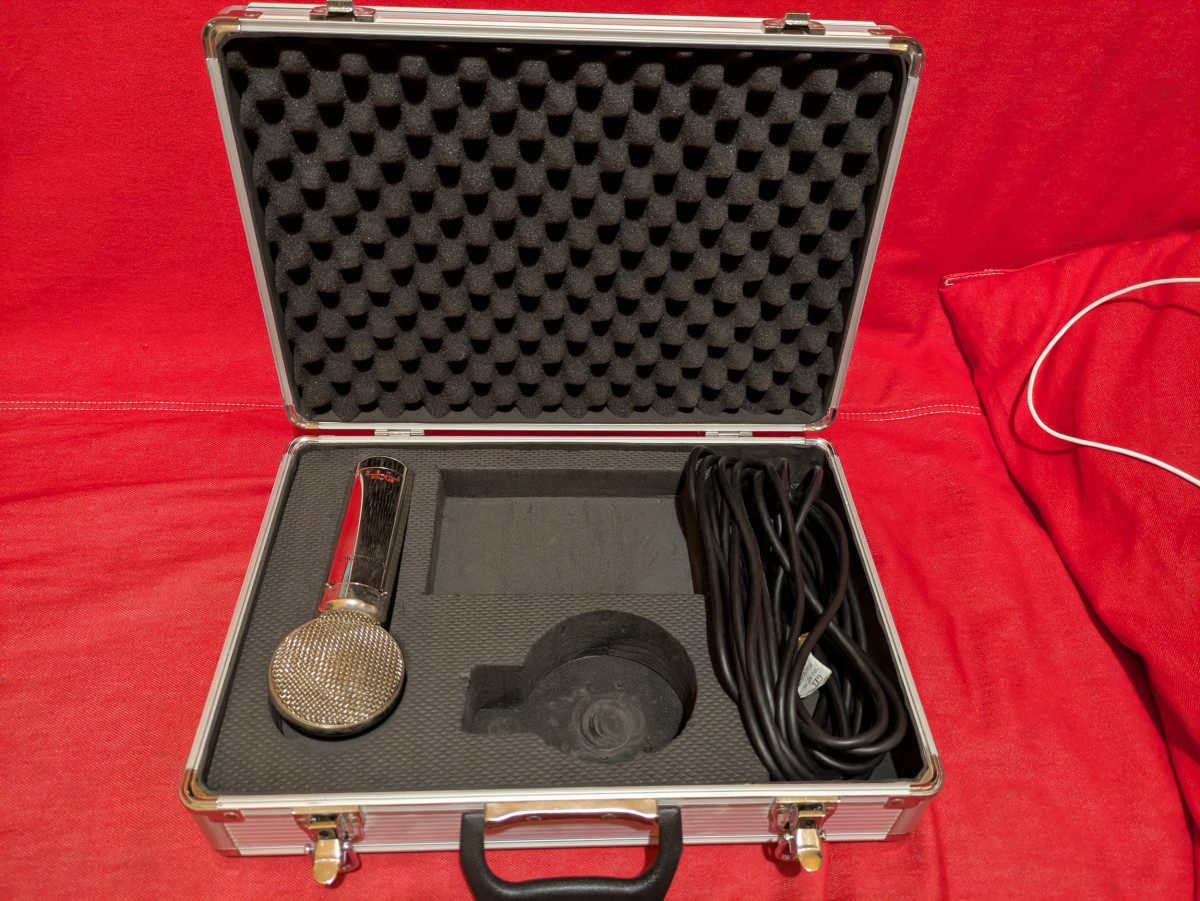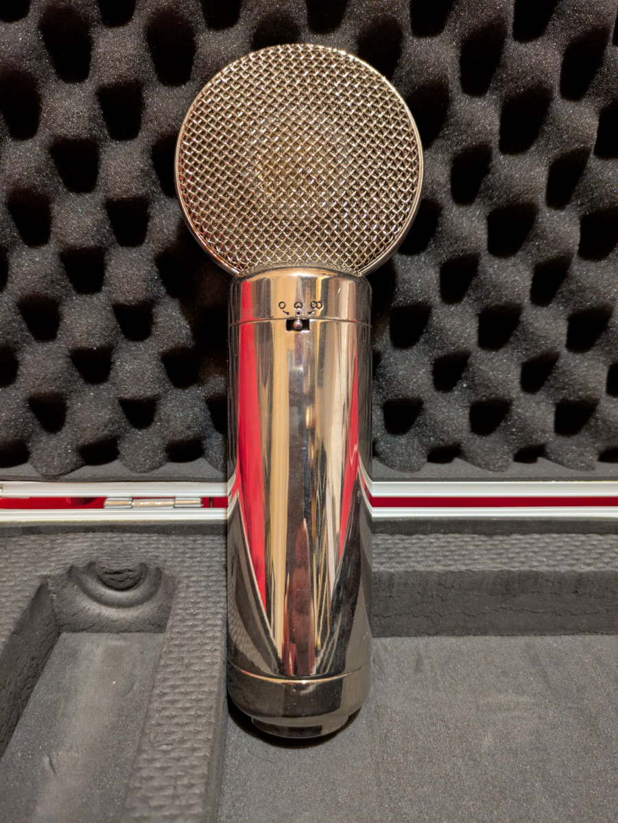 Micrófono de condensador de membrana grande a válvulas. Siempre en mi estudio libre de humos. Patrones polares cardioide, figura de 8 y omni. Puede recortar las frecuencias más graves con un switch y, con otro, seleccionar el nivel de salida.