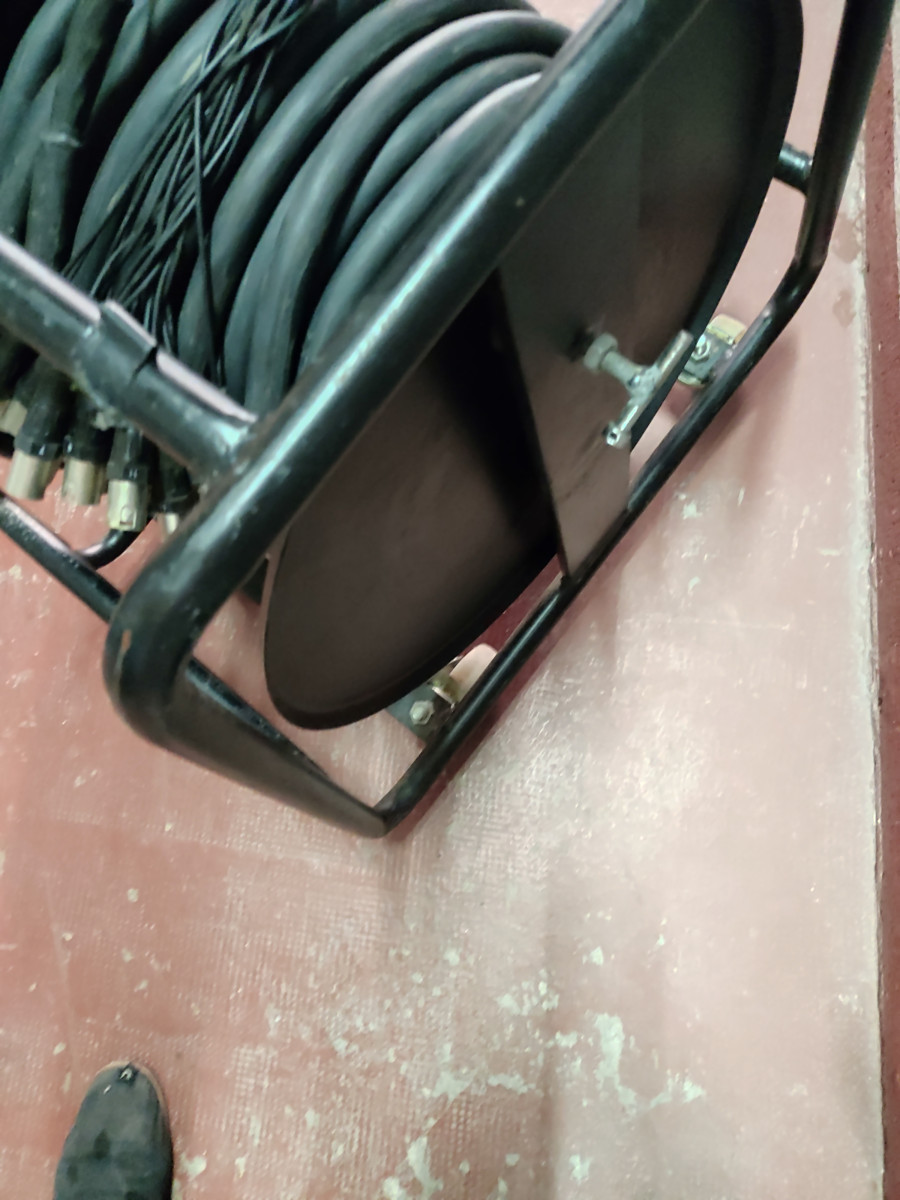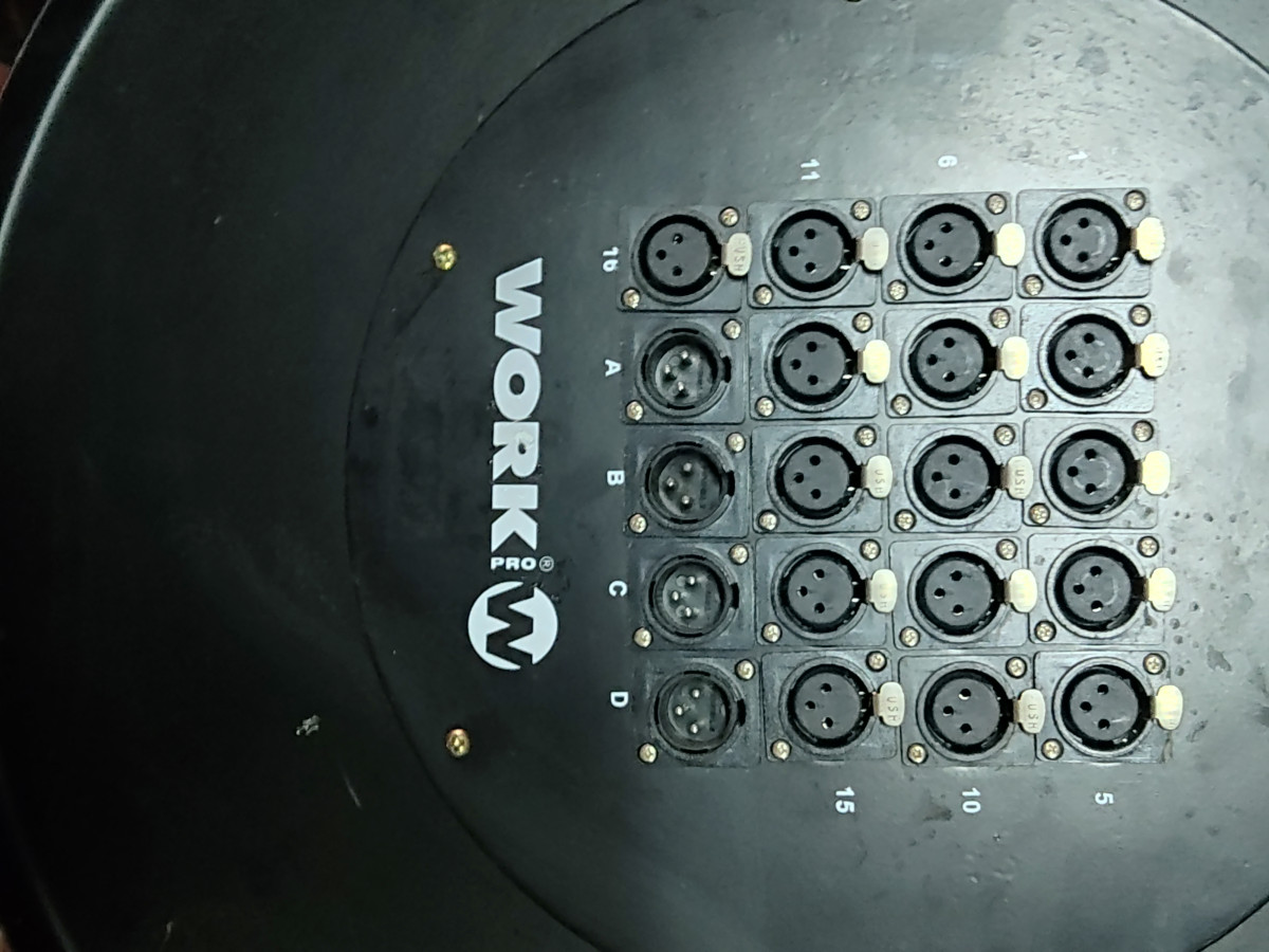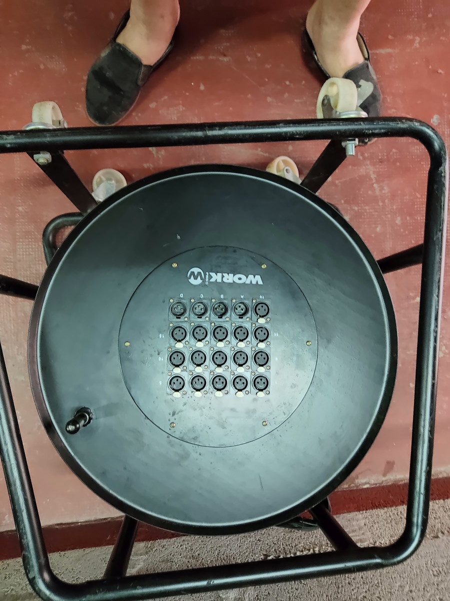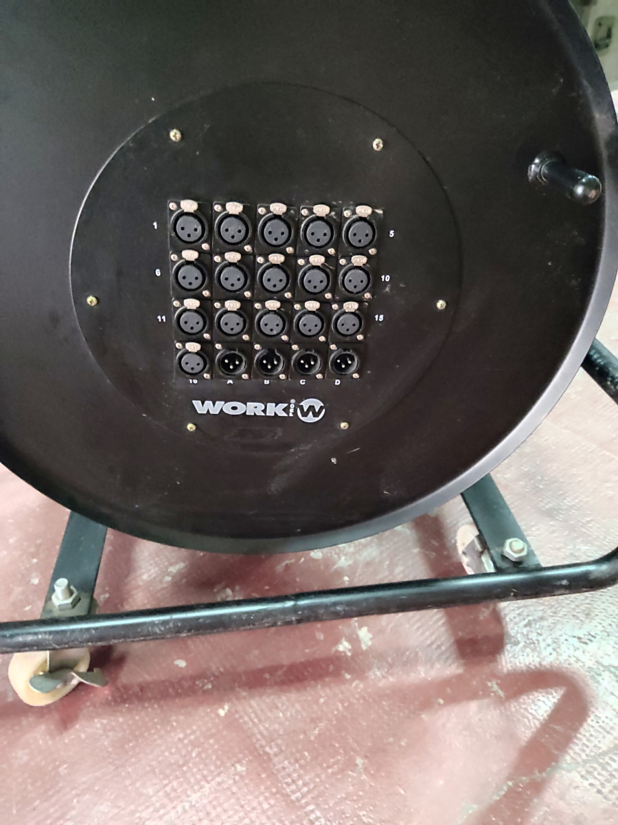 Vendo una manguera multipar de audio de 25 metros de longitud, alojada en un carro de transporte metálico con ruedas, que cuenta con 16 canales de envío y 4 de retorno. En un extremo dispone de 16 conectores XLR3 aéreos macho y 4 hembra, y en el otro, en el tambor del carro de transporte, cuenta con 16 conectores XLR3 hembra y 4 macho. Tanto los conectores aéreos como los instalados en el tambor cuentan con un número para poder ser identificados con facilidad.