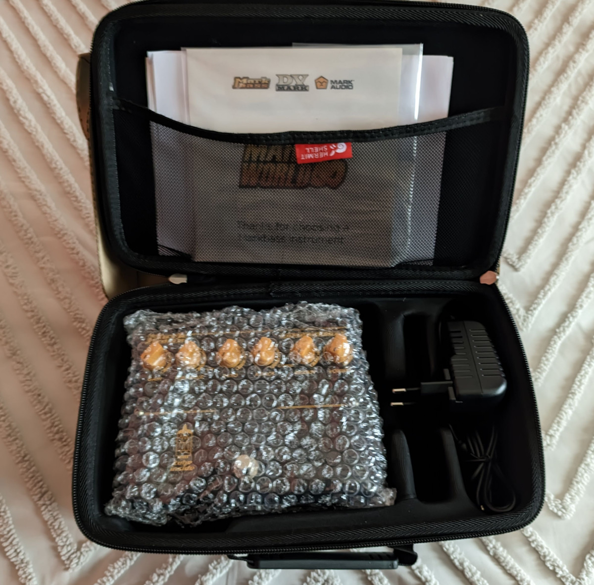 Lo mando con su caja, documentos, factura, fuente de alimentación y unos consejos de uso que me envío Markbass además de un estuche que compré para transportarlo que me costó 39€.