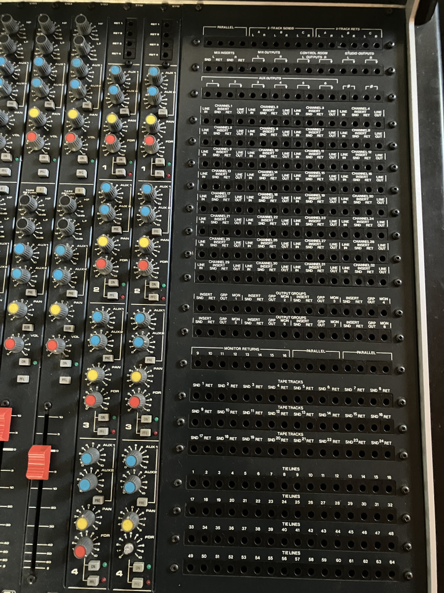 Mesa de mezclas analógica de 32 canales, 8 grupos y Master estéreo. Patch integrado, fuente de alimentación original, soporte y funda anti polvo.